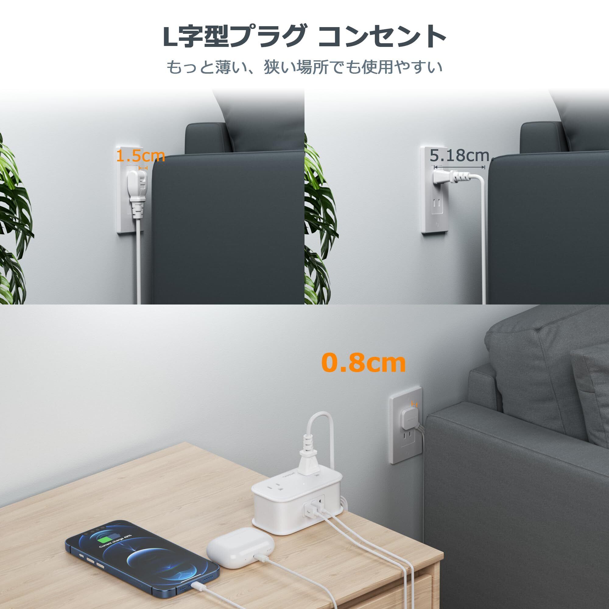 L字型プラグ コンセント付き:薄型プラグを採用しており、厚さはわずか2.54cmと一般的なプラグよりも薄いです。 収納時はコンセントに直接差し込めるので収納が楽になります。この小型軽量のテーブルタップは狭い場所に適しています。