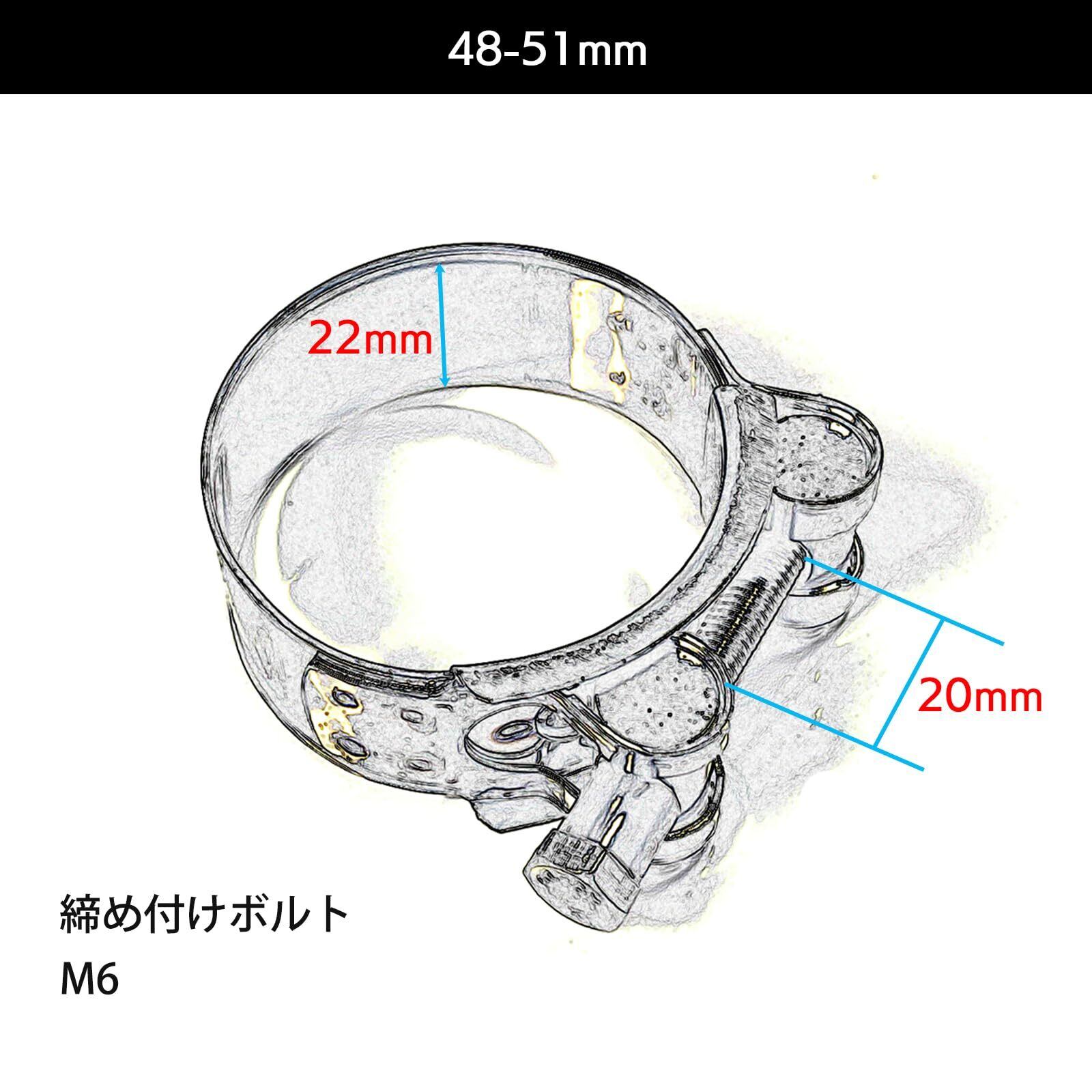 汎用品として販売されており、48-51mm、52-55mm、60-63mmのサイズ展開があり、さまざまなマフラー径に適応します。バンド幅は22mm、締め付けボルトはM6規格で長さ60mm。取り付け時の調整余裕も約3mm確保されているため、スムーズな設置が可能です。ボルトを締めることで簡単に固定でき、初心者の方でも手軽に取り付けられます。