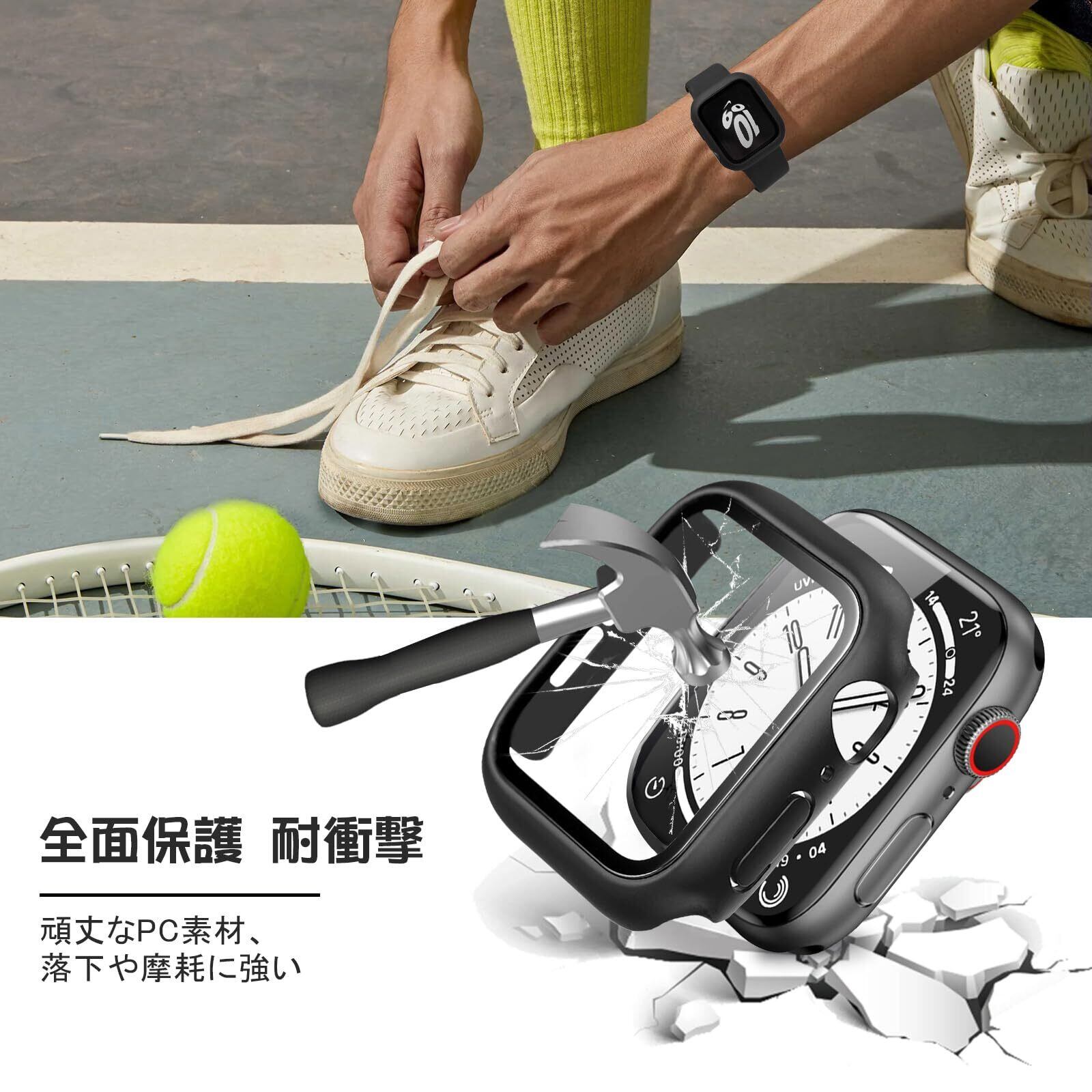 【全面保護】この製品はPC+ 強化ガラス素材を採用して、日常生活での衝撃から Watch を保護します。硬度 9H の強化ガラスで、超クリアな画面を提供して、なお画面の損傷を防止および回避し、 Watchをしかっり保護します。