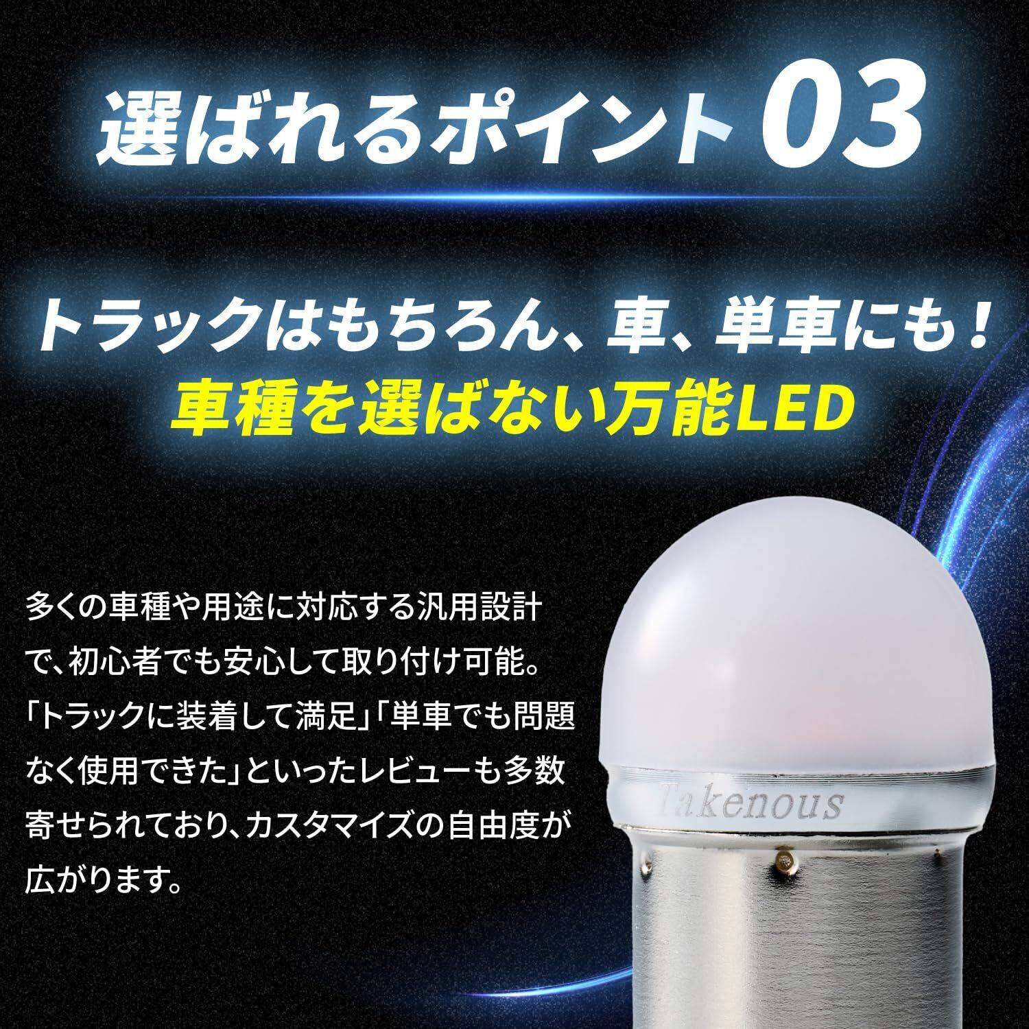 【トラックはもちろん、車、単車にも! 車種を選ばない万能LED】 多くの車種や用途に対応する汎用設計で、初心者でも安心して取り付け可能。 「トラックに装着して満足」「単車でも問題なく使用できた」といったレビューも多数寄せられており、カスタマイズの自由度が広がります。