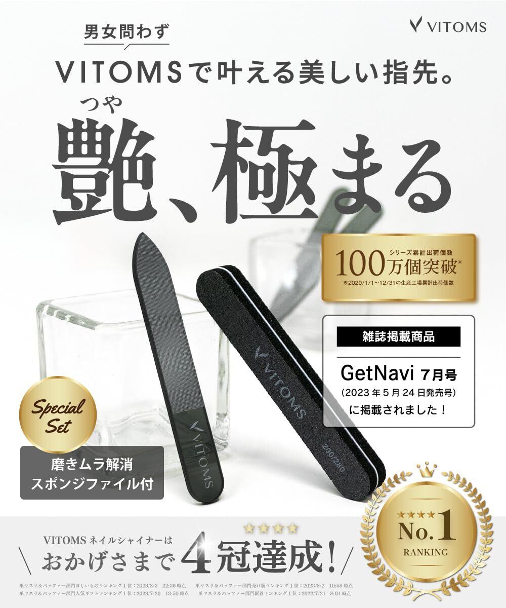 【プロネイリスト推薦】[VITOMS ネイルシャイナー(解説動画付)] こだわり仕様のつめみがき・つめやすり。キメの細かいヤスリ目が、爪の表面にワックスがけしたようなツルツル・ピカピカの輝きを与えます。爪みがきとしてだけでなく、爪の先端を整えるなど爪ヤスリとしてもご利用いただけます。/品質、デザイン、ケースの細部までこだわりました。プレゼントやギフトにもピッタリなパッケージでお届けいたします。※本商品は雑貨です。
