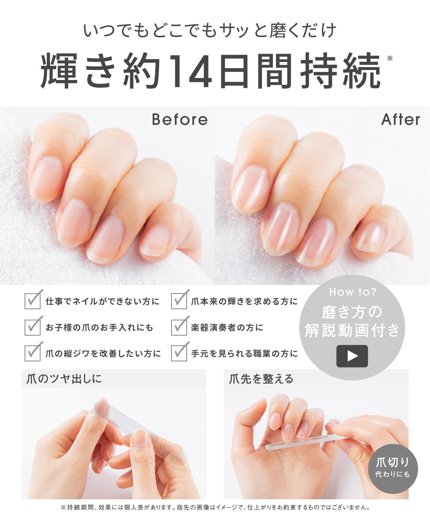 【爪のお悩みスッキリ!】いつでもどこでもサッと磨くだけ、マニュキアいらずのお手軽ケア。爪のつや出しから伸びた爪のお手入れまで、これ一本でサロンの仕上がりに。「ネイルサロンに行く時間がない…」「ネイルケアが面倒…」「自宅で手軽にケアしたい…」そんな方にピッタリ。普段使いのネイル・爪ケア用品としてご活用ください。初めての方向けに、プロネイリストのが解説する『磨き方の解説動画』も付属しております。