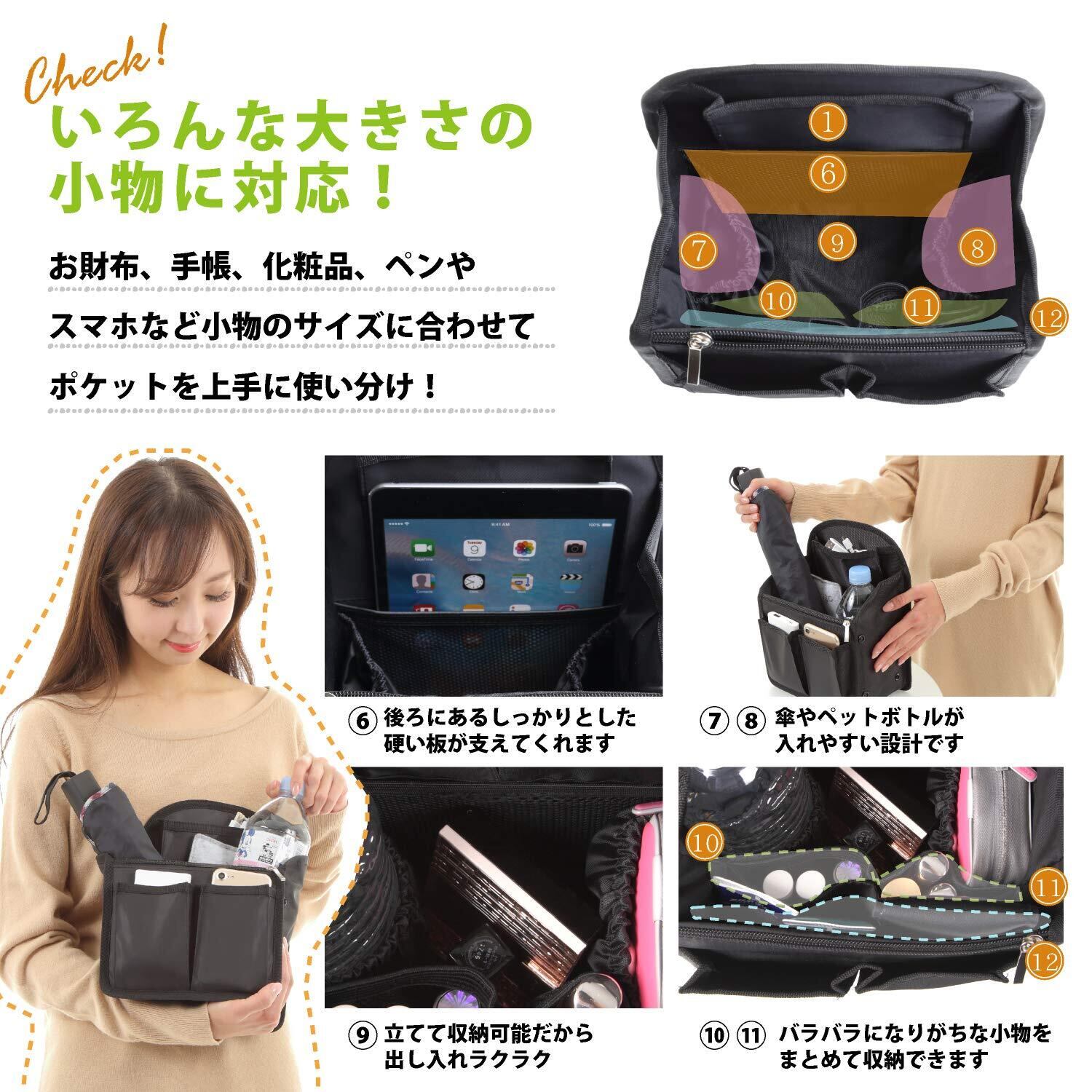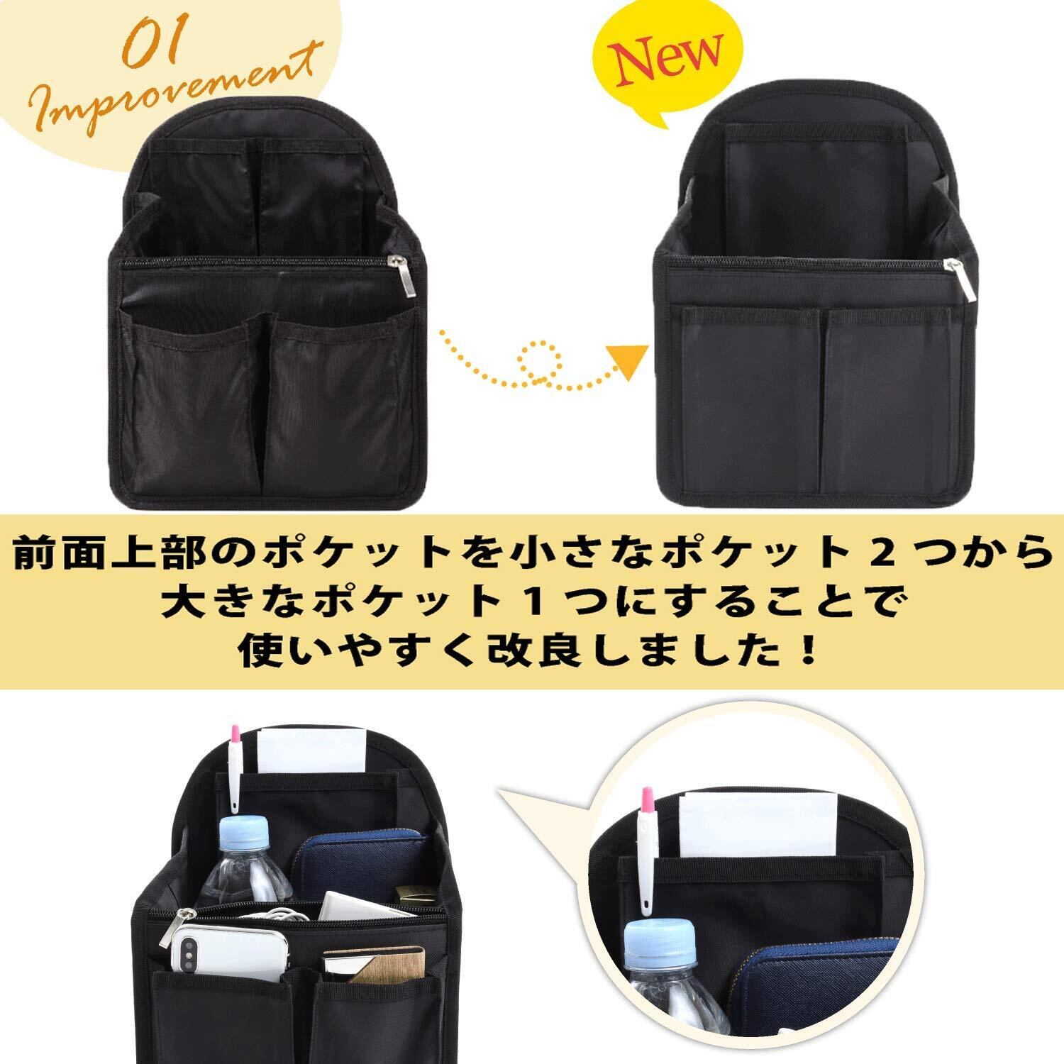 お客様の声によりポケットを変更 上部のポケットを小さいポケット2つから大きなポケットに変更、背面ポケットを全面ポケットに変更、それにより、上部ポケットに入れる大きなスマホでも収容可能となりました。また、背面を大きなポケット一つにする事で、長財布、iPad、書籍等を入れてお使い頂けるようになりました。PP底板付きなのでより安定性も向上致しました。