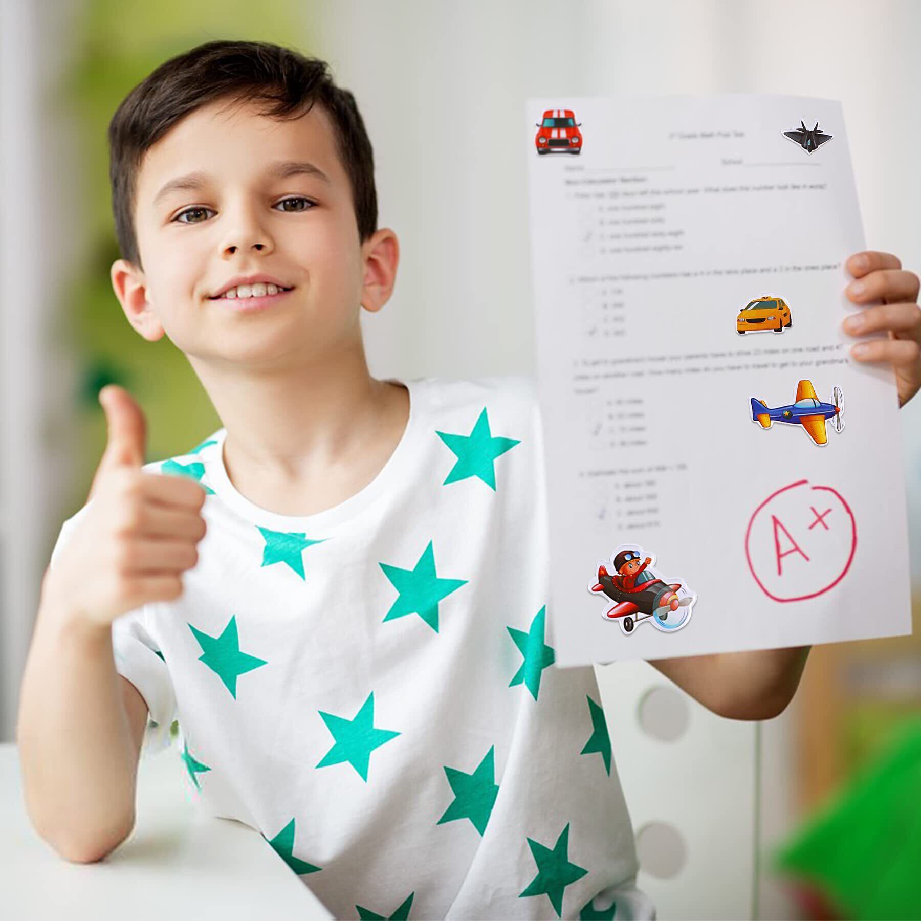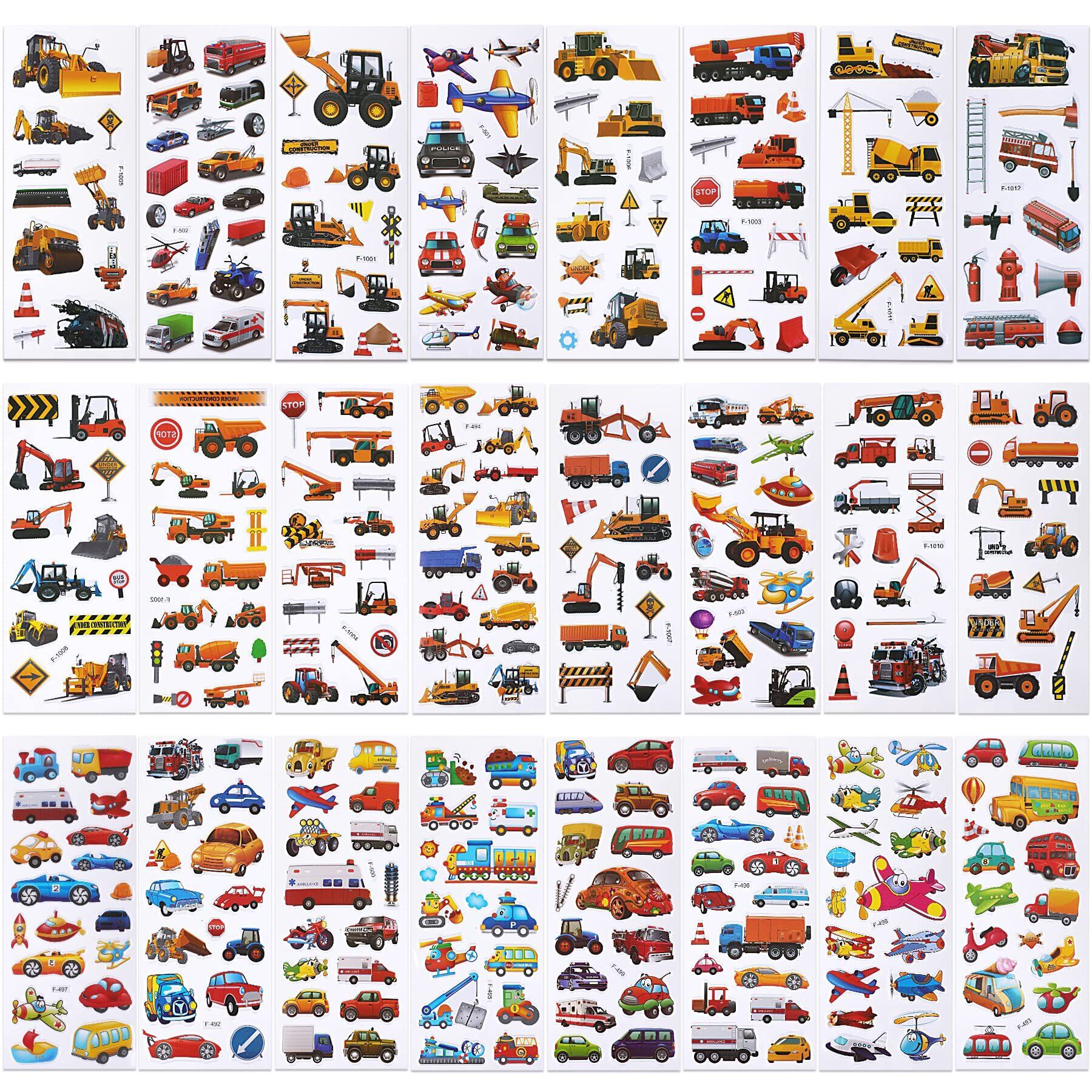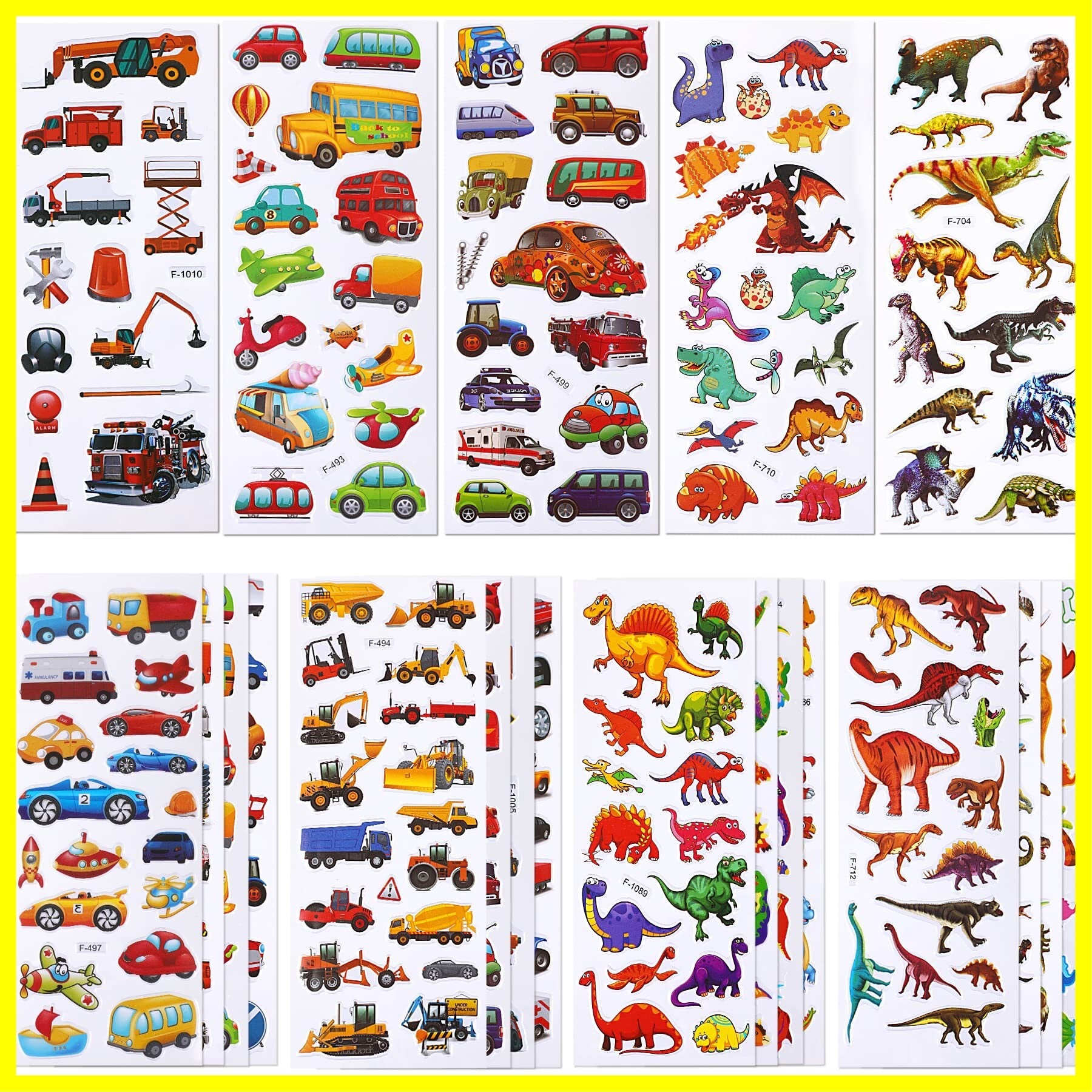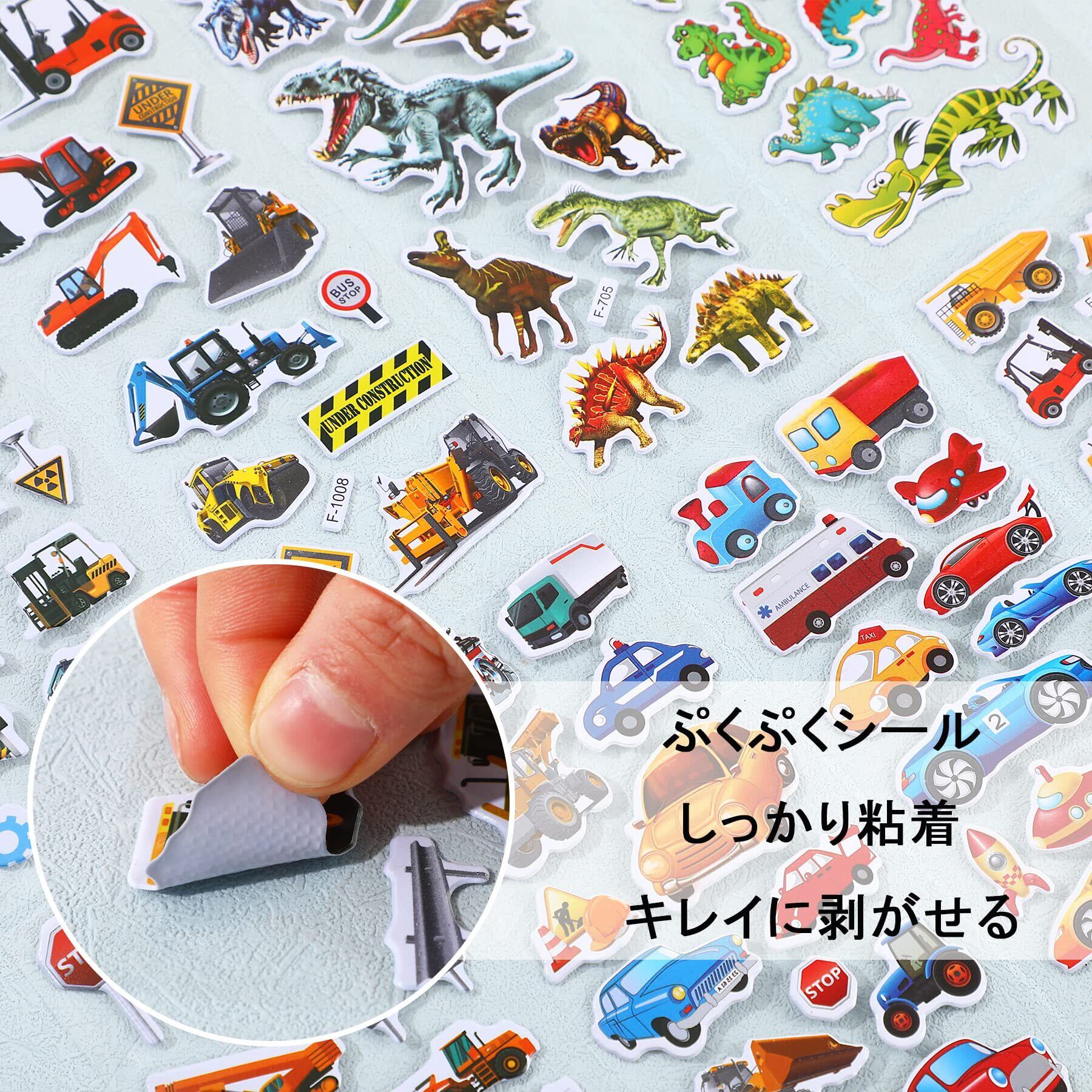 【豊富なデザイン】ステッカーのパターンは主に乗り物や恐竜ですが、デザイがそれぞれ違います。ティラノサウルス、トリケラトプス 、スピノサウルス、ブラキオサウルスなど、様々な恐竜シールがあります。車シールについては、バス、タクシー、消防車、ヘリコプター、ショベルカーなど、多様な種類の絵柄もあります。