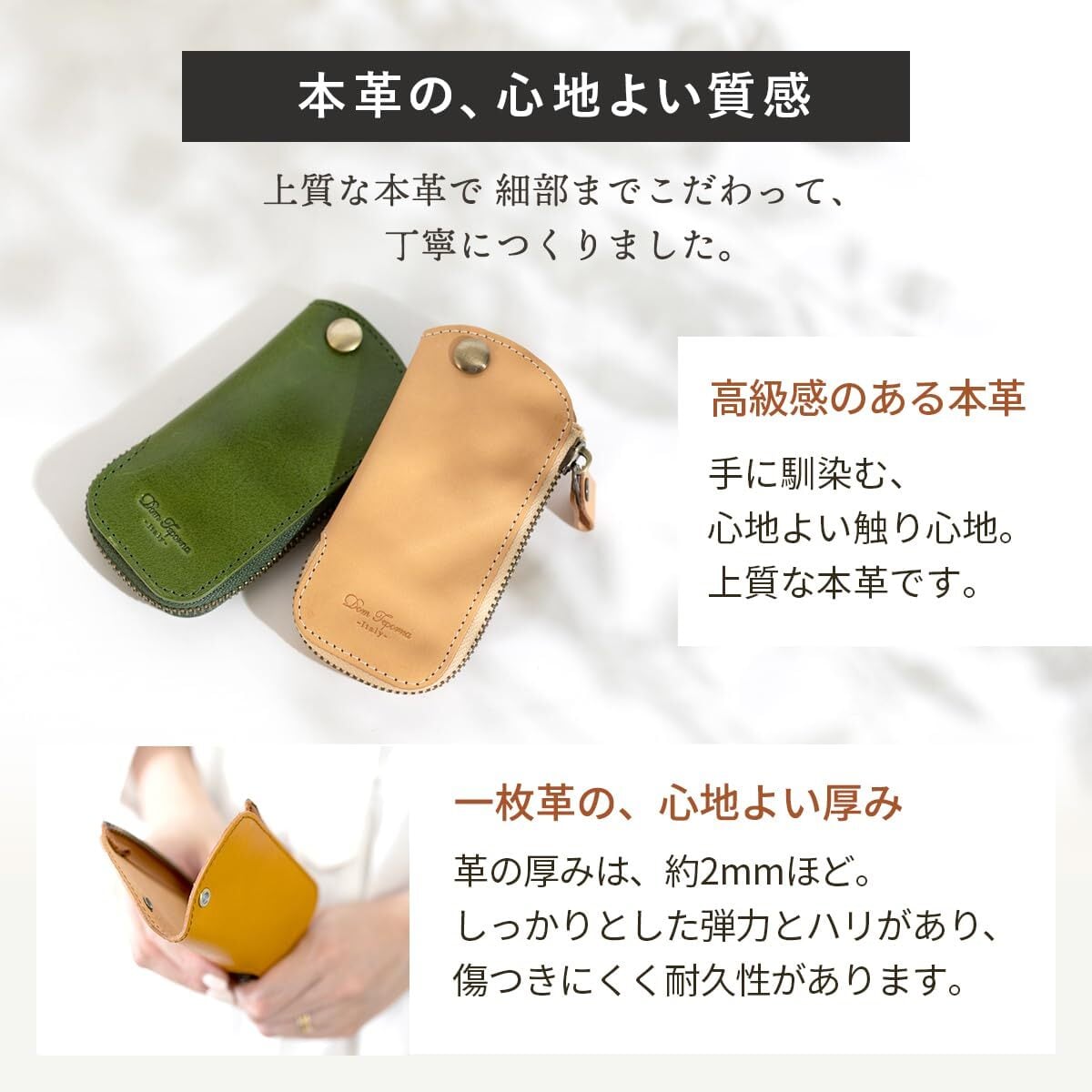 【こだわりのイタリアンレザー】伝統的な製法で仕上げた一枚革を贅沢に使用しました。使い込むほどに色合いが変化するエイジングを楽しめる素材です。美しさだけでなく、堅牢かつしなやかな本革は大切な鍵をしっかりと包み守ります。