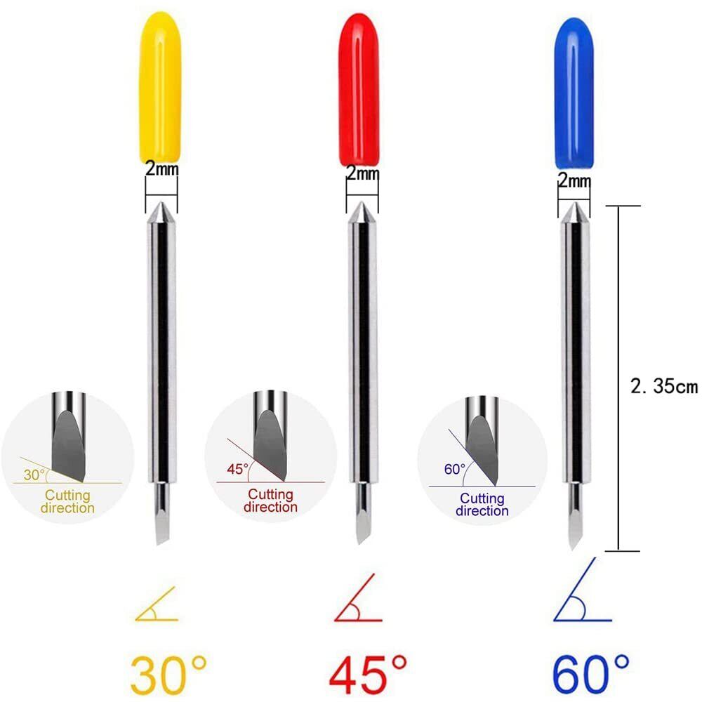 【3種類のブレード】多くのカッティングプロッタに3種類のブレードデザインが使用できます。30°のブレードは、主に非常に薄いウィンドウティントやマイラー樹脂の切断に使用されています。45°のブレードは、標準的なキャスティングおよびカランダー加工のビニールやその他の薄い素材に推奨されています。60°のブレードは、反射フィルムやサンドブラスト耐性素材などの厚い素材に適しています。