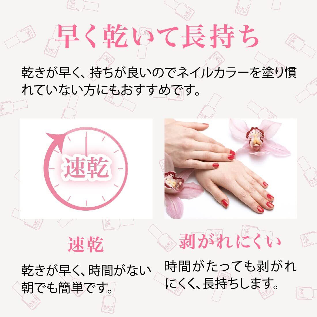 【 ベースコート トップコート 配合 】 ベースコートとトップコート、両方の効果が備わっているので、ひと塗りできれいな仕上がりに。 乾きが早く、持ちが良いのでネイルカラーを塗り慣れていない方にもおすすめしています。