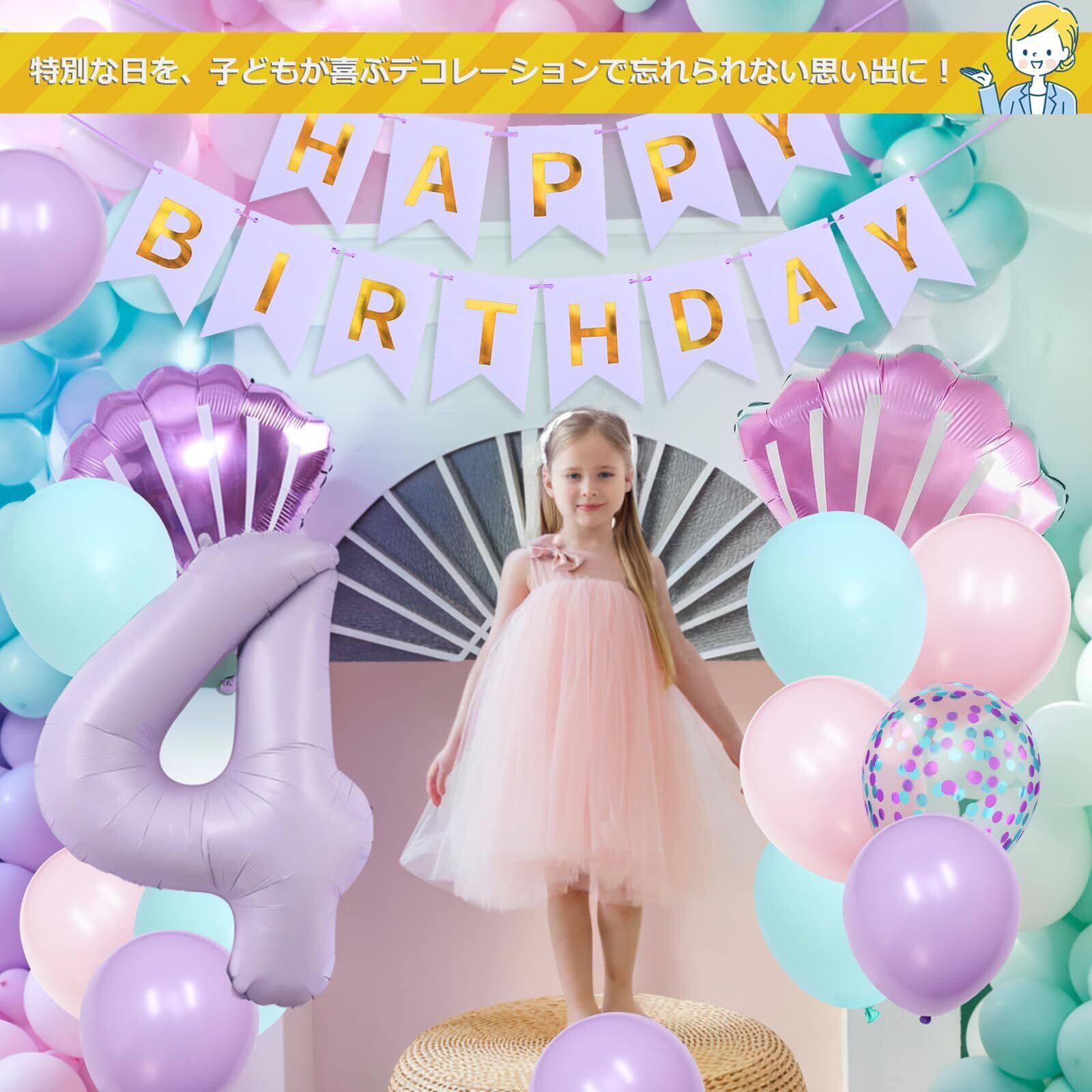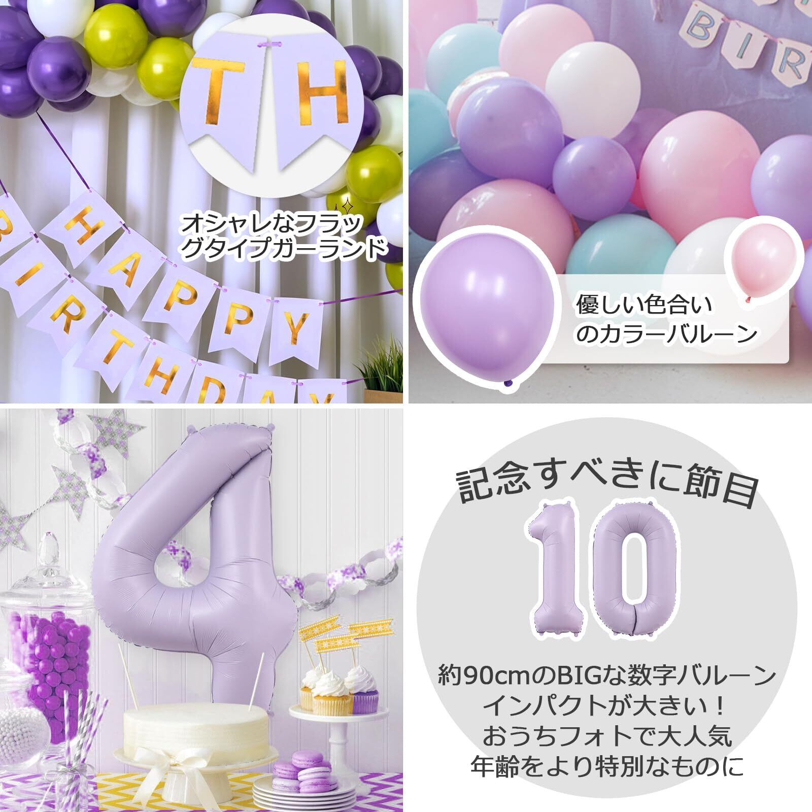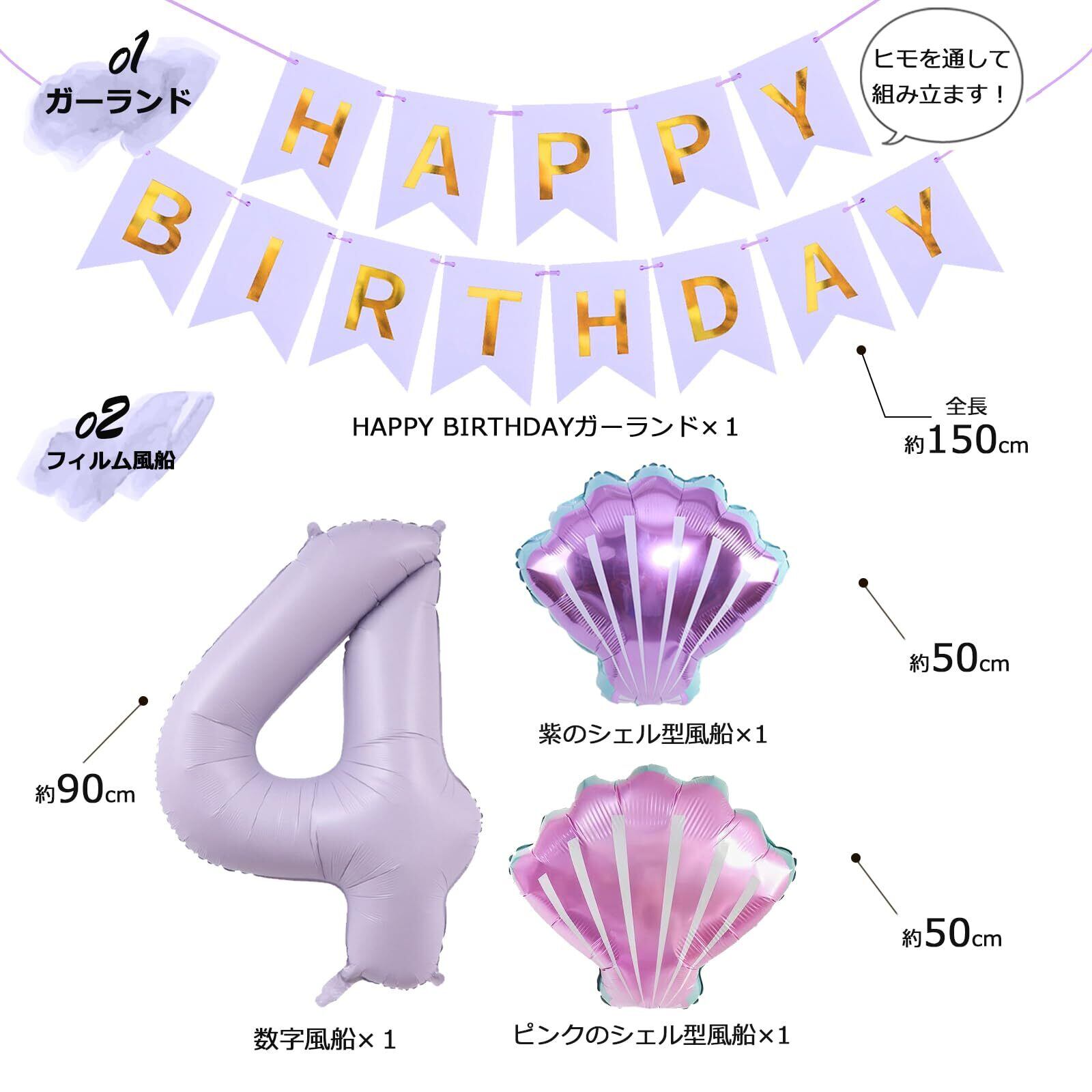 Lausatek バルーン 誕生日 4歳 風船セット HAPPY BIRTHDAY バースデー ガーランド バースデー 飾り付け 数字4 シェル 装飾 お祝い イベント 子ども 男の子 女の子 パープル