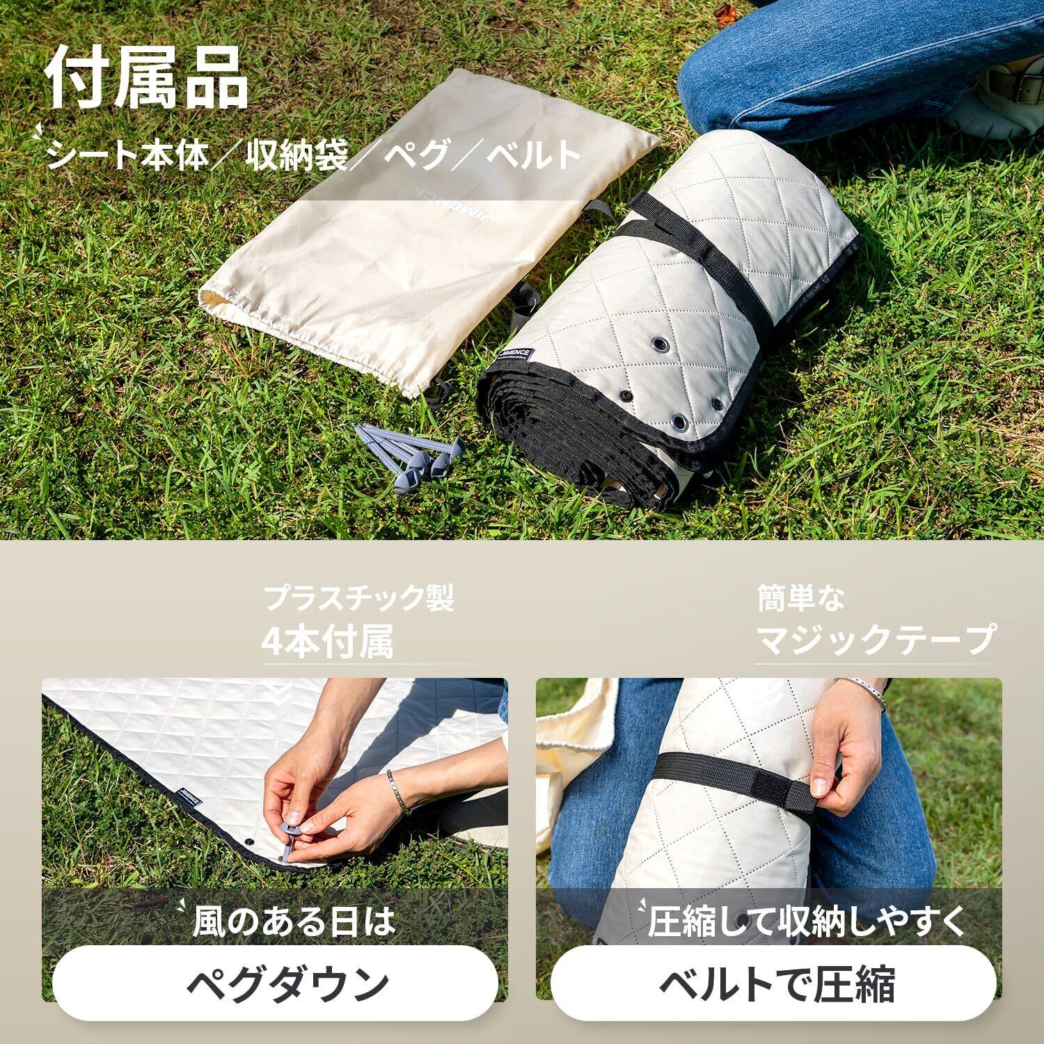 【素材】表面:シャリシャリの心地良い肌触りで通気性が良く、汗をかいた素肌で触れても”ぬるっ”としません。/中綿:中綿を詰めていますので軽度のクッション性があります。スポンジに比べて畳みやすく、通気性も良いのが特徴です。/裏面:防水加工(PUコーティング)を施していますので水たまりの上に敷いても染みません。ピクニックや日帰りレジャーならこれ1枚でOKです。