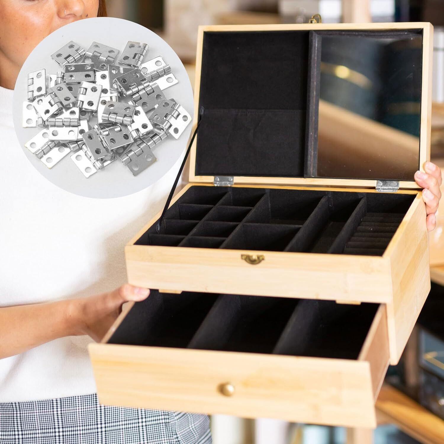 ️【セット内容】セットにはヒンジ50個とネジ200個が含まれており、日常生活には十分です。 ️【サイズ】8*10mm。さらに、ヒンジの回転角度は約0°~270°で、開閉しやすく使いやすい。 ️【上質な素材】家具用ミニヒンジは、錆や腐食に強く、表面が滑らかでバリのない優れた青銅製で、取り付けや位置決めの際に手を傷つけません。 ️【 機能性】4つの取り付け穴、安定した位置決め穴、強力な軸により、サポート力と重量バランスが向上します。 ️【様々な用途】アンティーク木箱、木製ケース、宝石箱、ドア、タンス、キャビネット、食器棚などに適用。その美しいデザインは、製品をより魅力的にします。