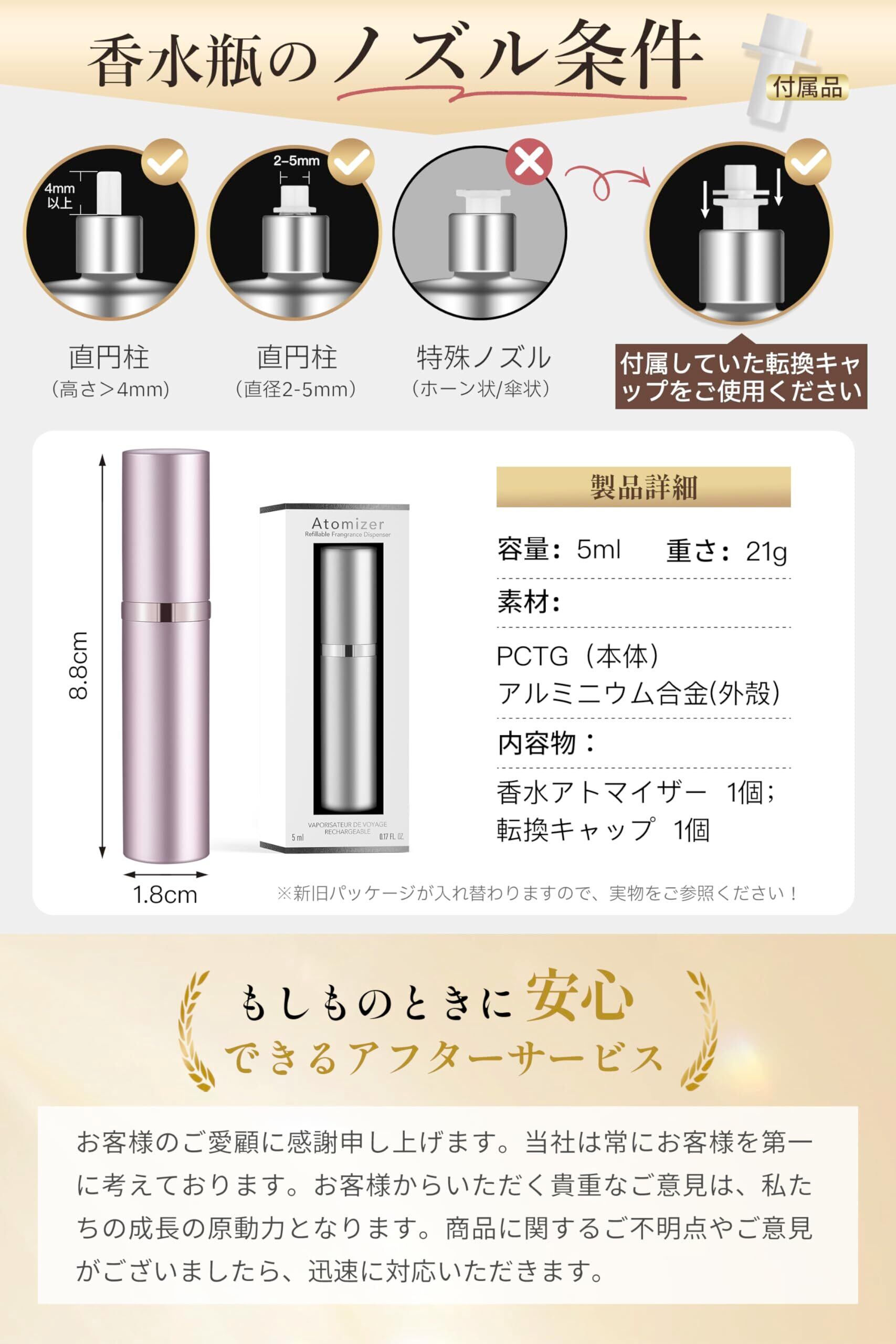 【超簡単・詰め替え方法】STEP1:香水瓶のノズルを抜きます。STEP2:本体を軽く回して、気密性を緩めた後、スムーズに引き抜きます。STEP3:本体の底をノズルにセットして押し出します。新しいアップグレードにより、直径2~3mmまたは3~5mmの直円形ノズルを持つあらゆる香水瓶を直接詰め替え可能です。特殊ホーン状や傘状のノズルにも、付属転換キャップで対応します
