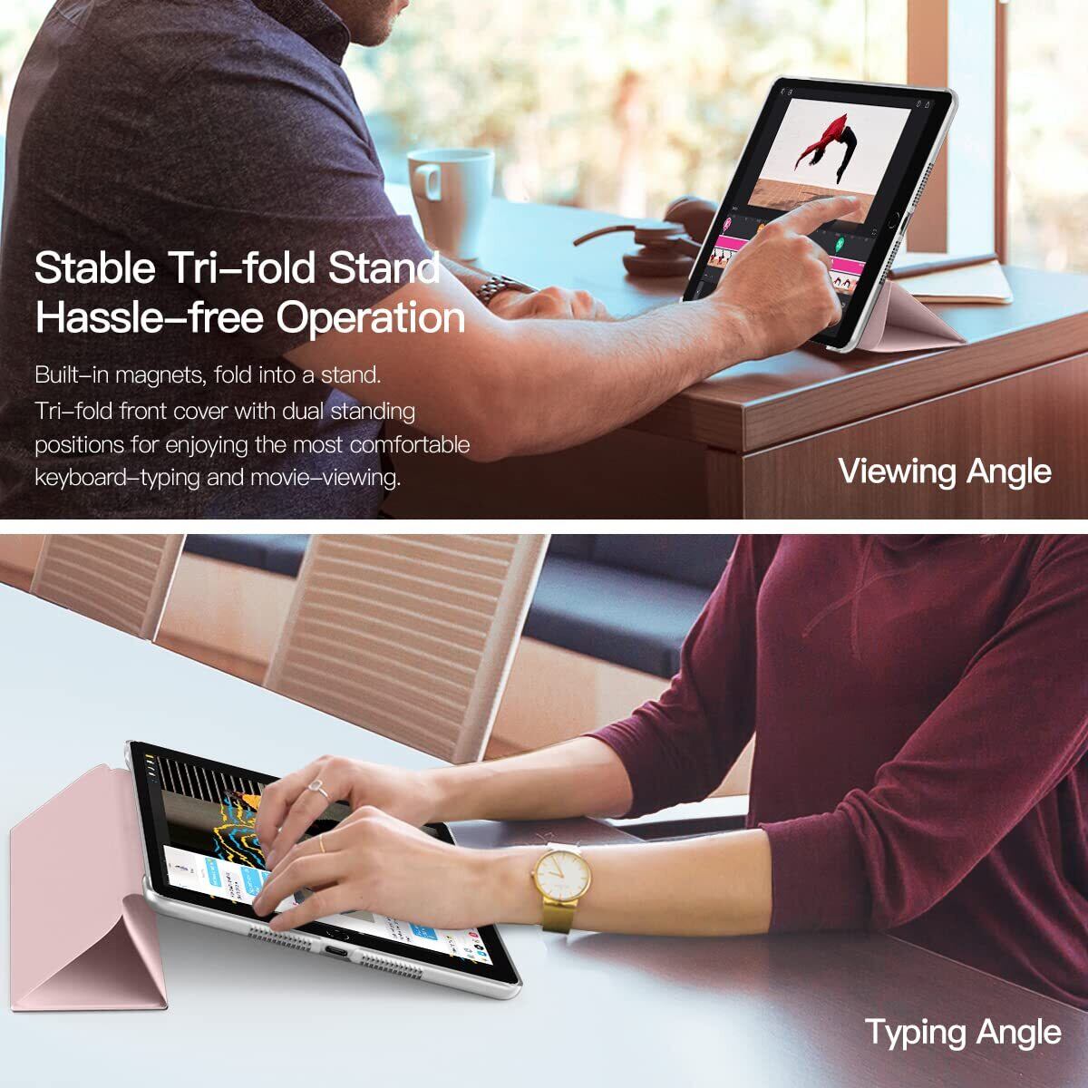 【三つ折り設計】 三つ折りのフロントには、複数のマグネットが均等に内蔵されています。ご大切なiPadを立てて使用する際にしっかりサポートし、安定した角度を維持したまま快適にお使いいただけます。