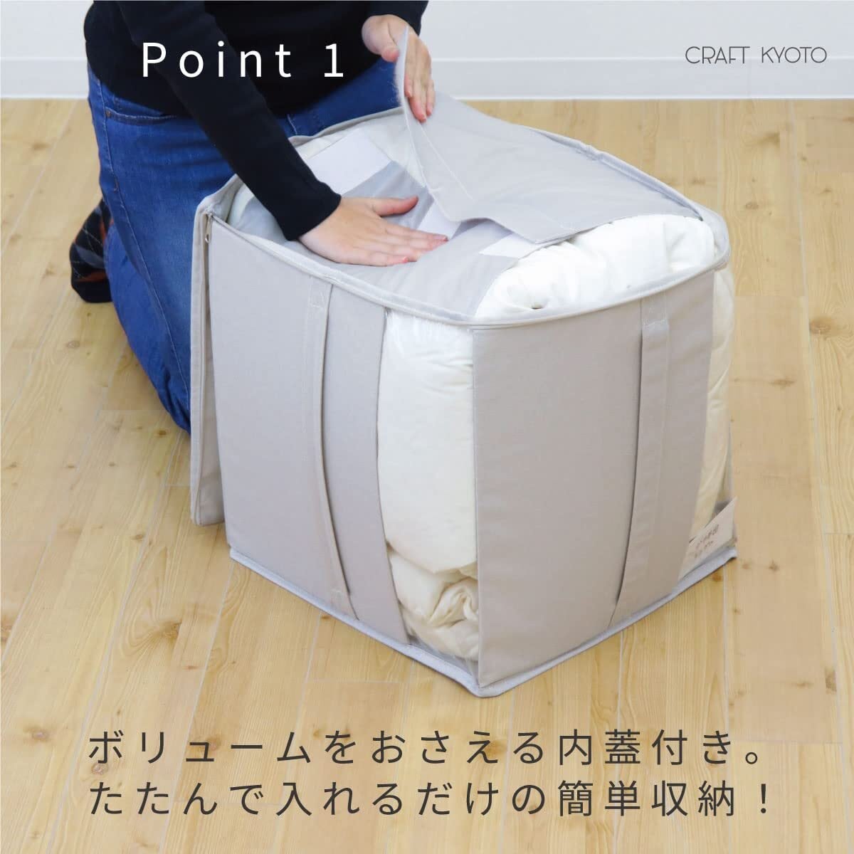 ボリュームをおさえる内フタ付の布団収納ケース。たたんで入れるだけの簡単収納。