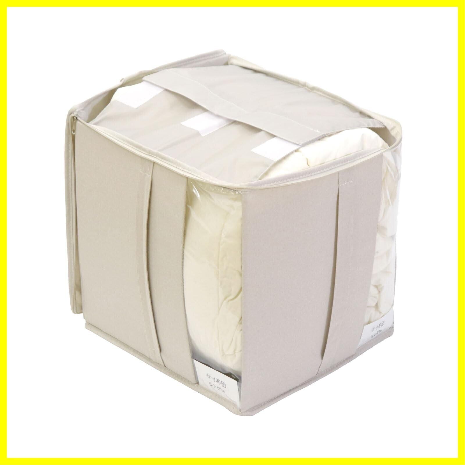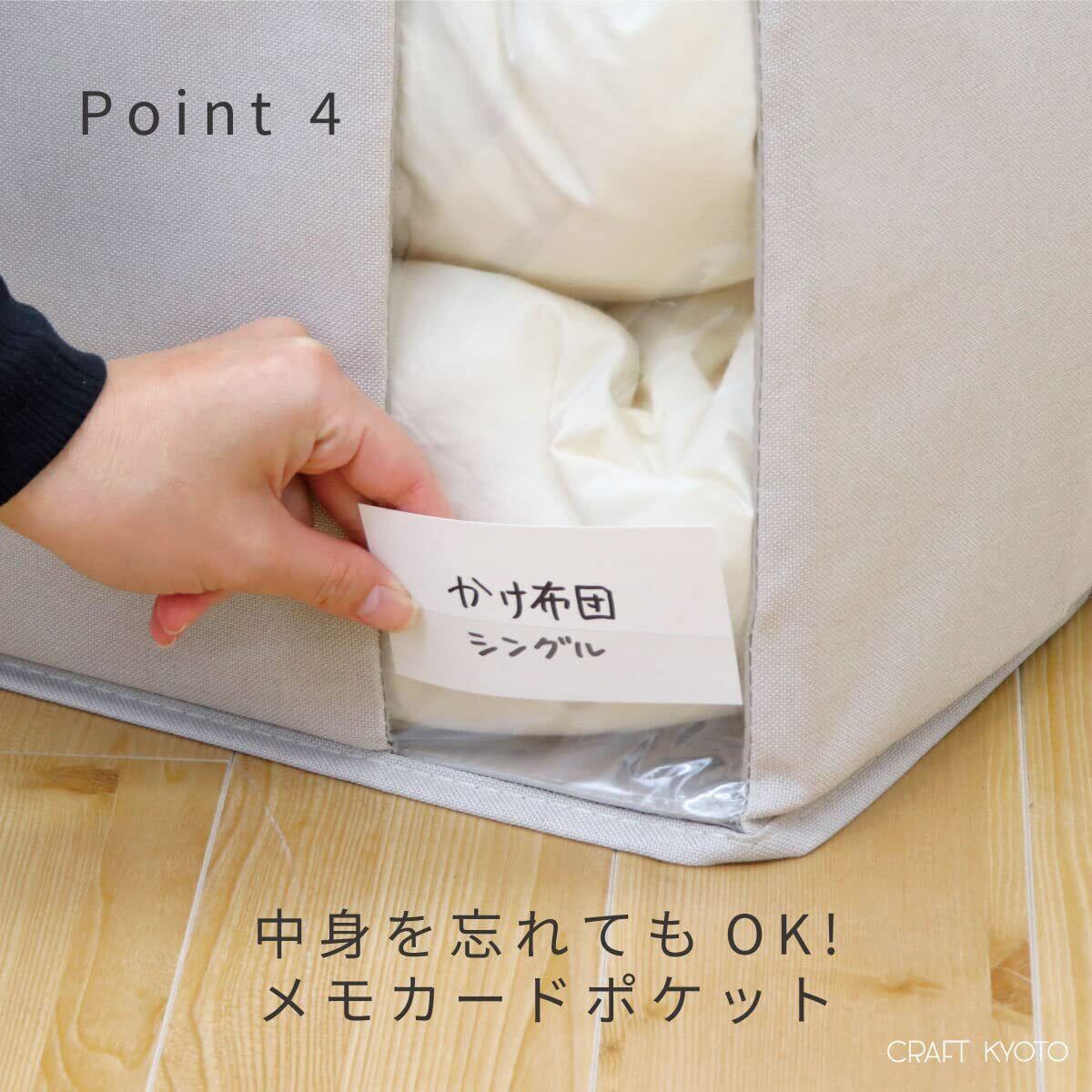 お片付けコンシェルジュ(R)がお悩み解決! お片付けコンシェルジュ(R)と一緒に すっきり便利!を目指して考えました! 【Point1】ボリュームをおさえる内蓋付き! たたんで入れるだけだから簡単収納! 【Point2】開閉しやすいダブルファスナーの外蓋 【Point3】中がみえる!透明窓 【Point4】中身を忘れてもOK!メモカードポケット 【Point5】軽くてしっかり自立!側面芯材入り 【Point6】ホコリはさっと乾拭き!お手入れ簡単生地 【Point7】高い所に置いても掴みやすい取っ手 【Point8】芯材入りでも軽くてもちやすい! 布団入りで約3.7kg ※シングル掛け布団2kg、カバー1kgの場合 【Point9】同じシリーズの別売りサイズと揃えてきれい! 衣装ケースの上もおすすめ!