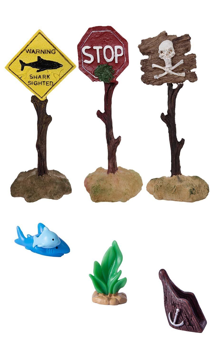 ️サメの警告標識&サメ親子、ドクロ標識&沈没船など、楽しいストーリーが浮かび上がるオブジェです