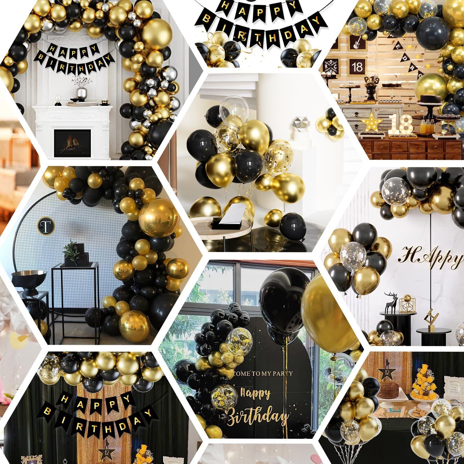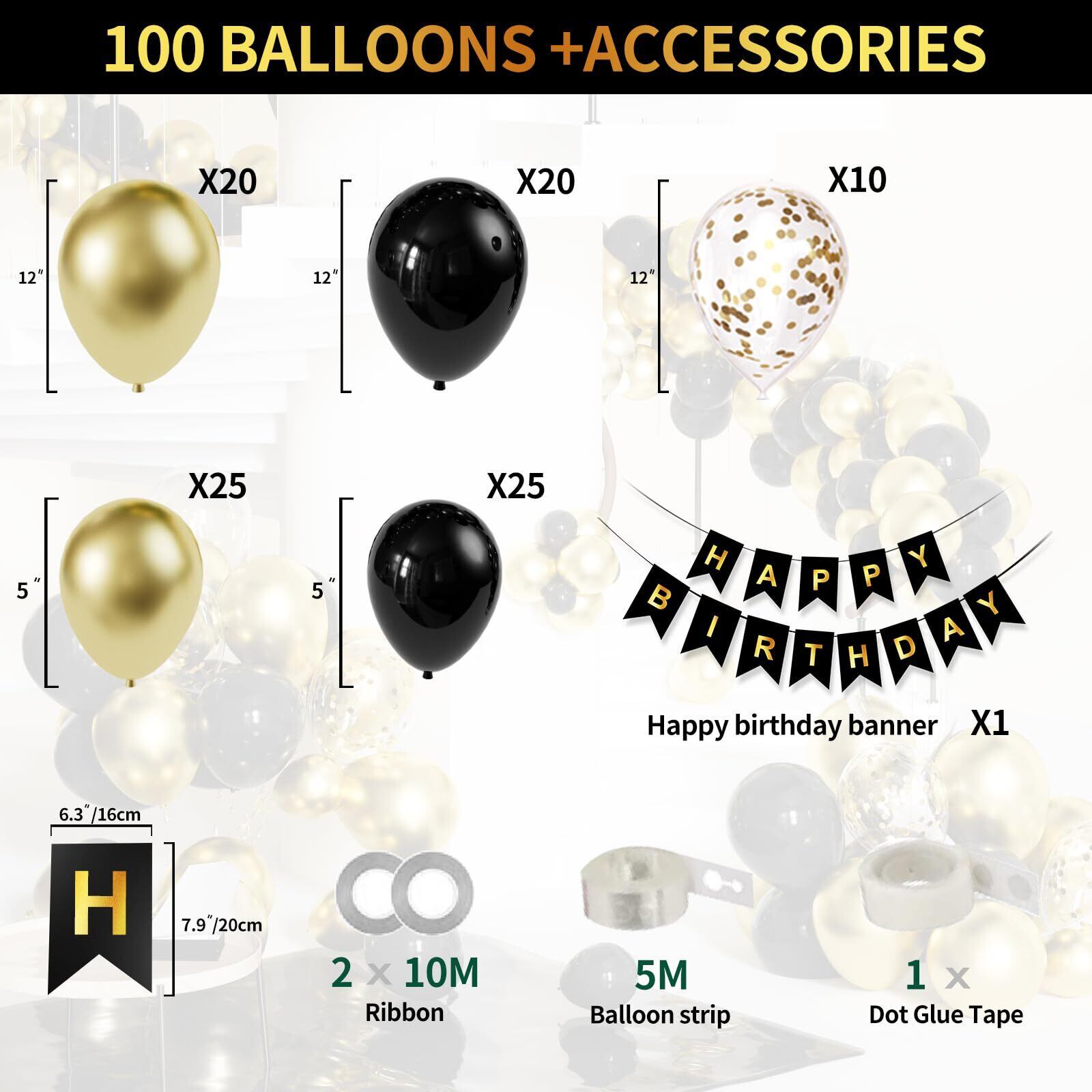 パッケージに含まれるもの:100pcs風船(黒、金、金紙吹雪)、1pcs事前にひもで縛られた大きな幸せな誕生日のバナー、1 *ドットのり、1 *バルーンストリップ、2 *リボンを含む。