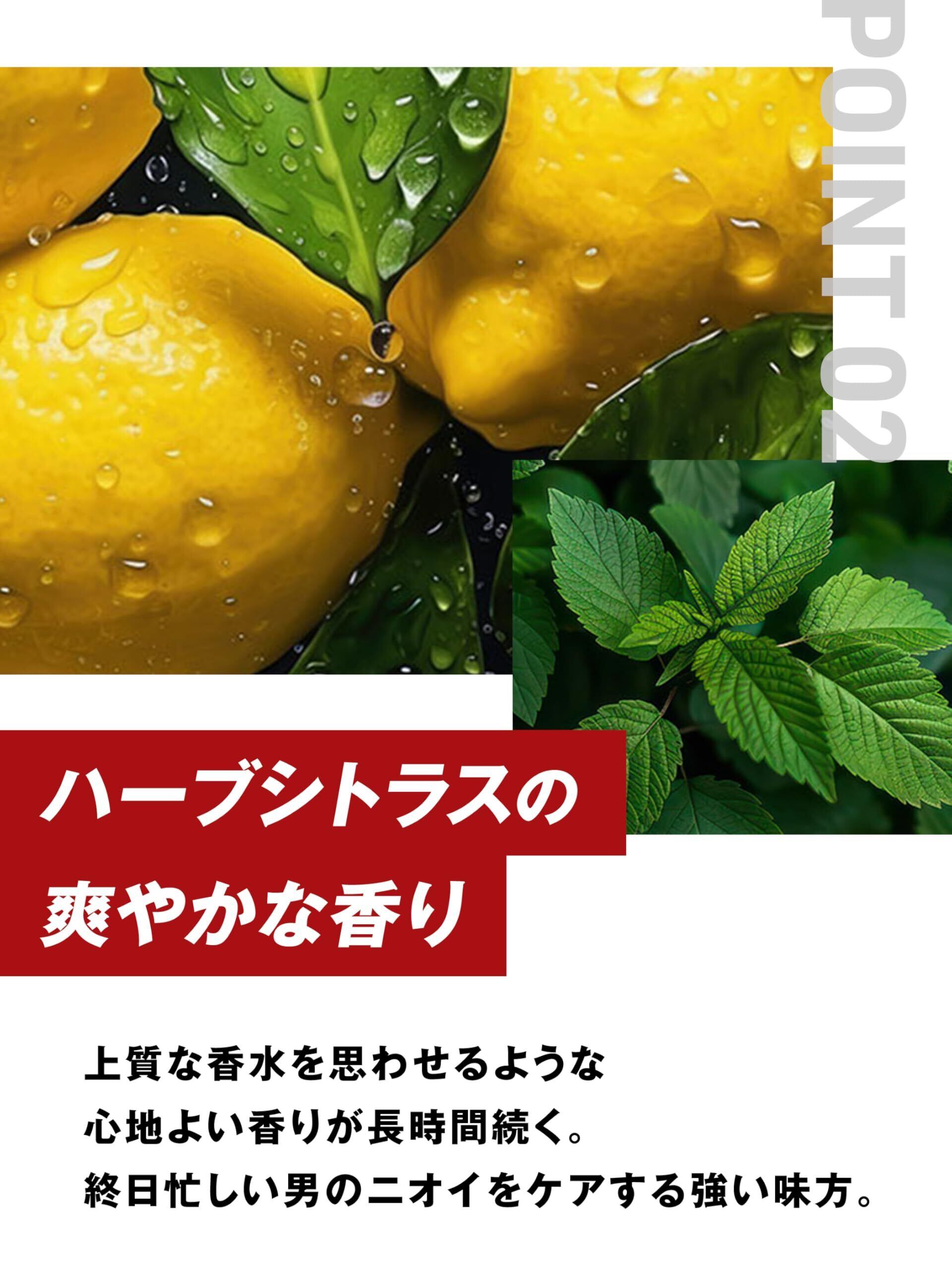 【香り持続】心地よい香りが長時間続く。終日忙しい男のニオイをケアする強い味方。