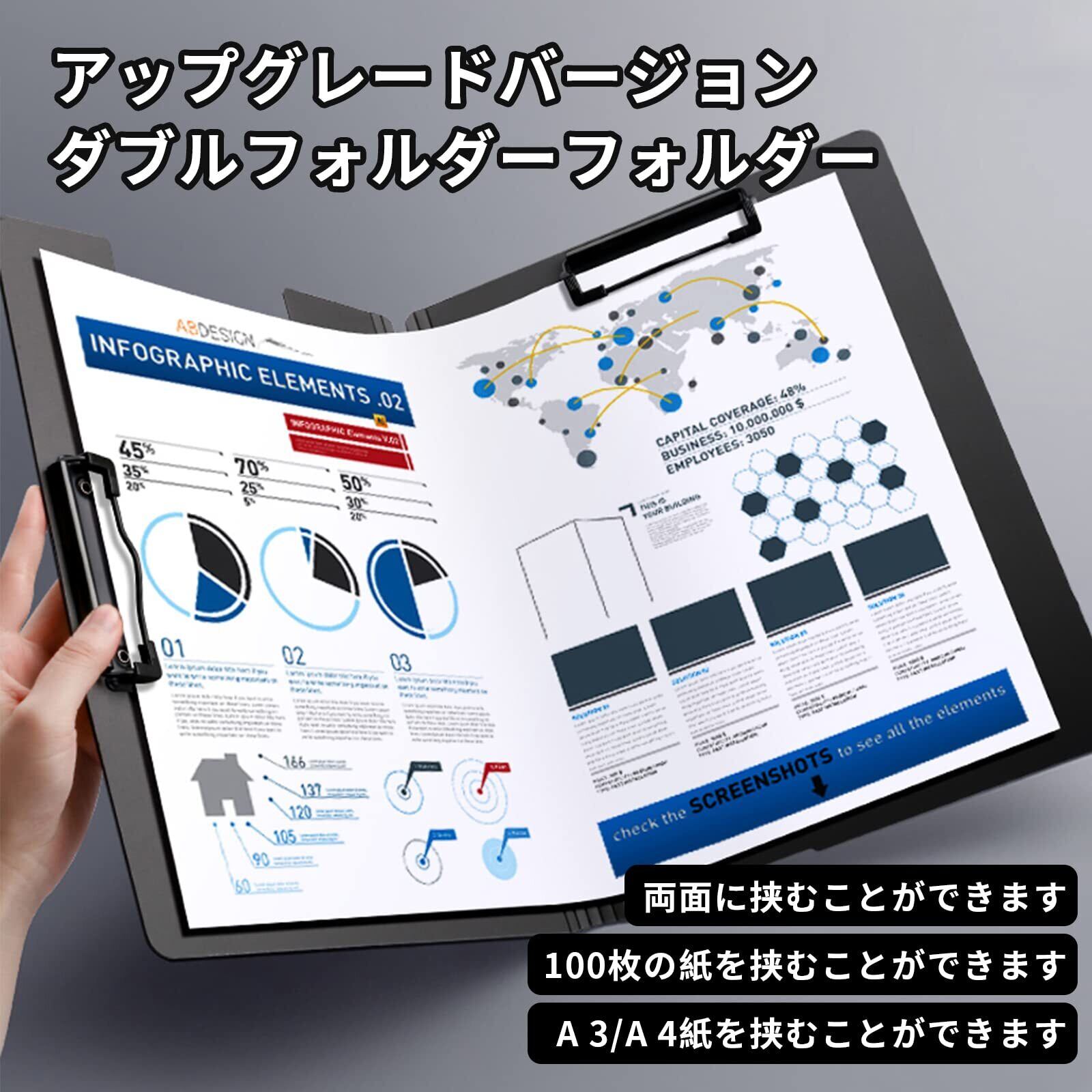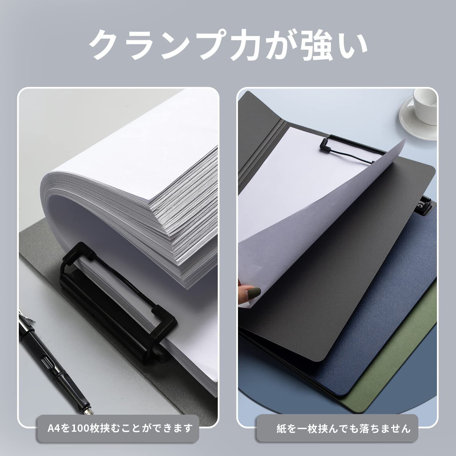【ダブルクリップ設計】ファイルの両面各クリップがあり、クリップ力が強い、1~100枚のA4紙を挟んで、一枚で挟まれることもできます。