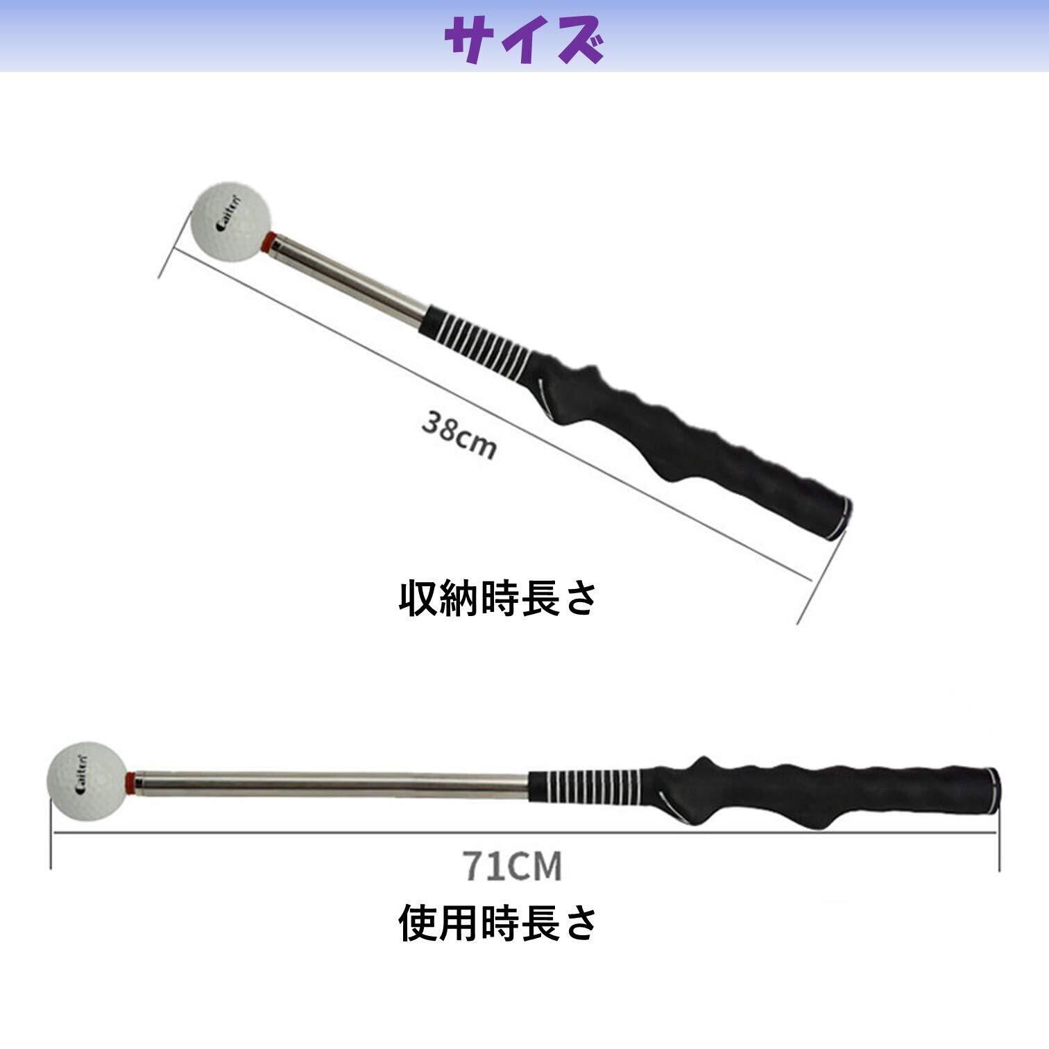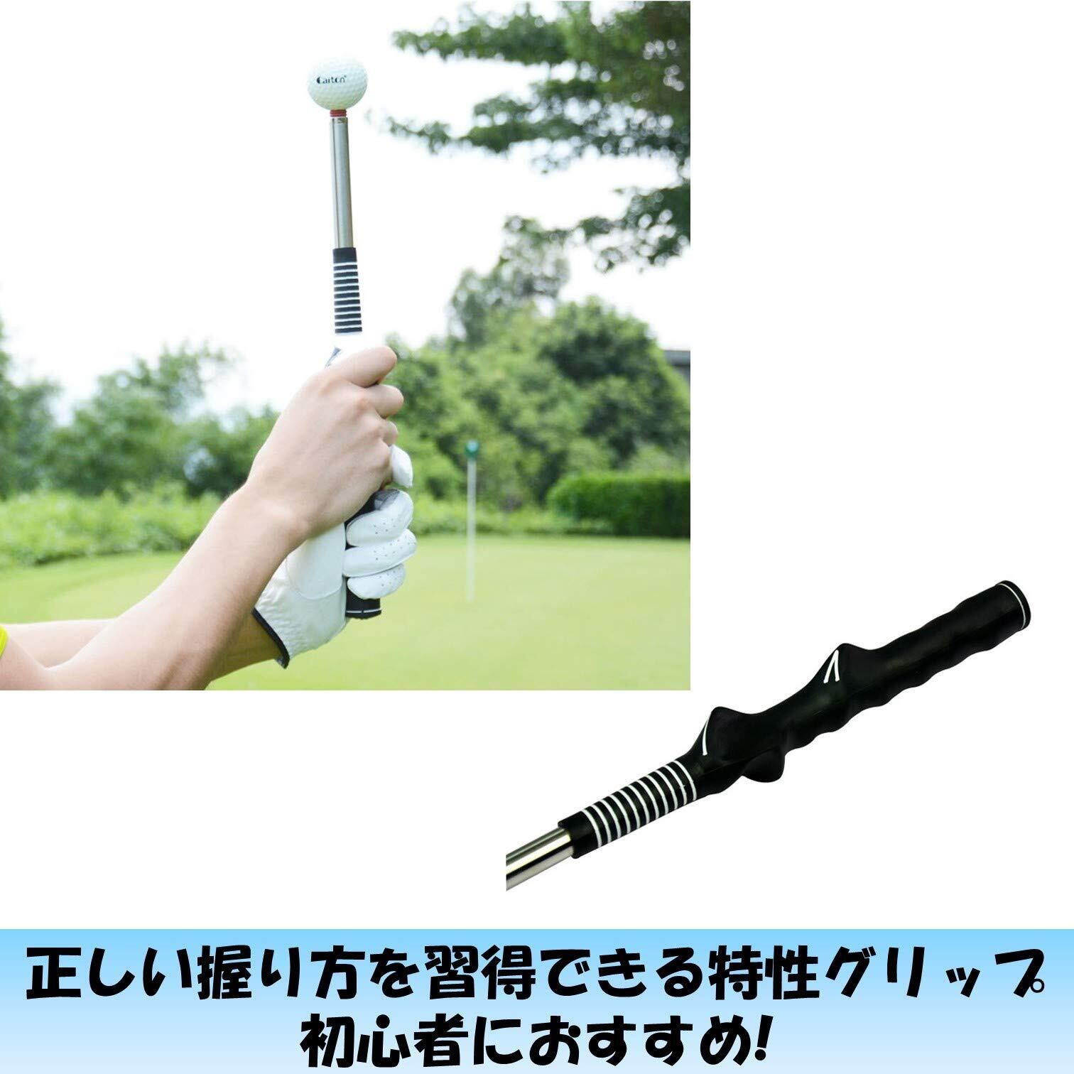 伸縮式なので収納時は短く、使用時は長くでき、ちょっとした休憩時間に本格的なスイング練習ができます。グリップの握りが正しい形に矯正できる形状になっているので、初心者の方でも握りからフォームまで正しく練習できます。