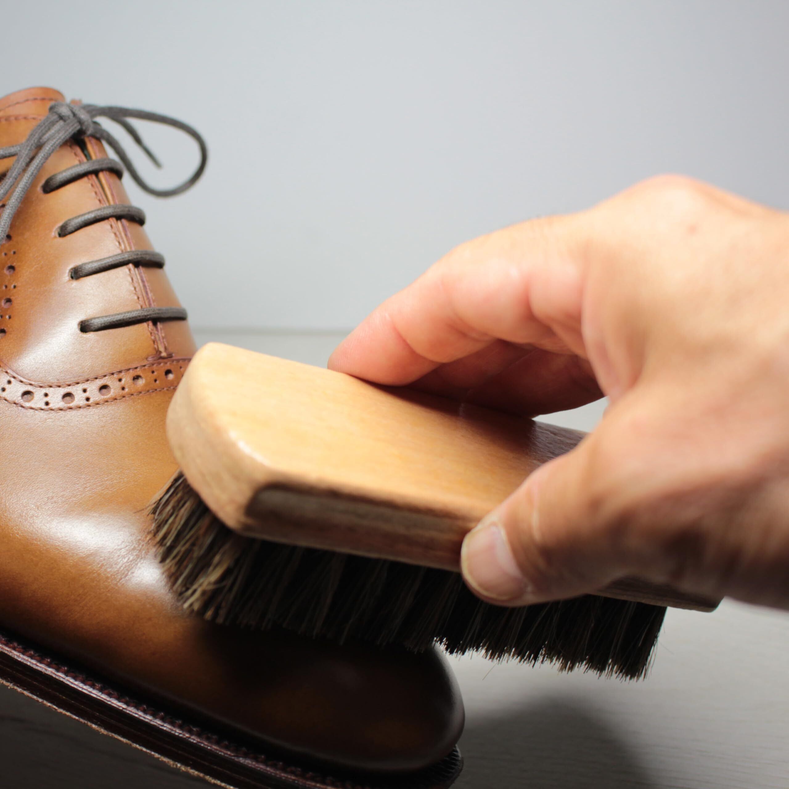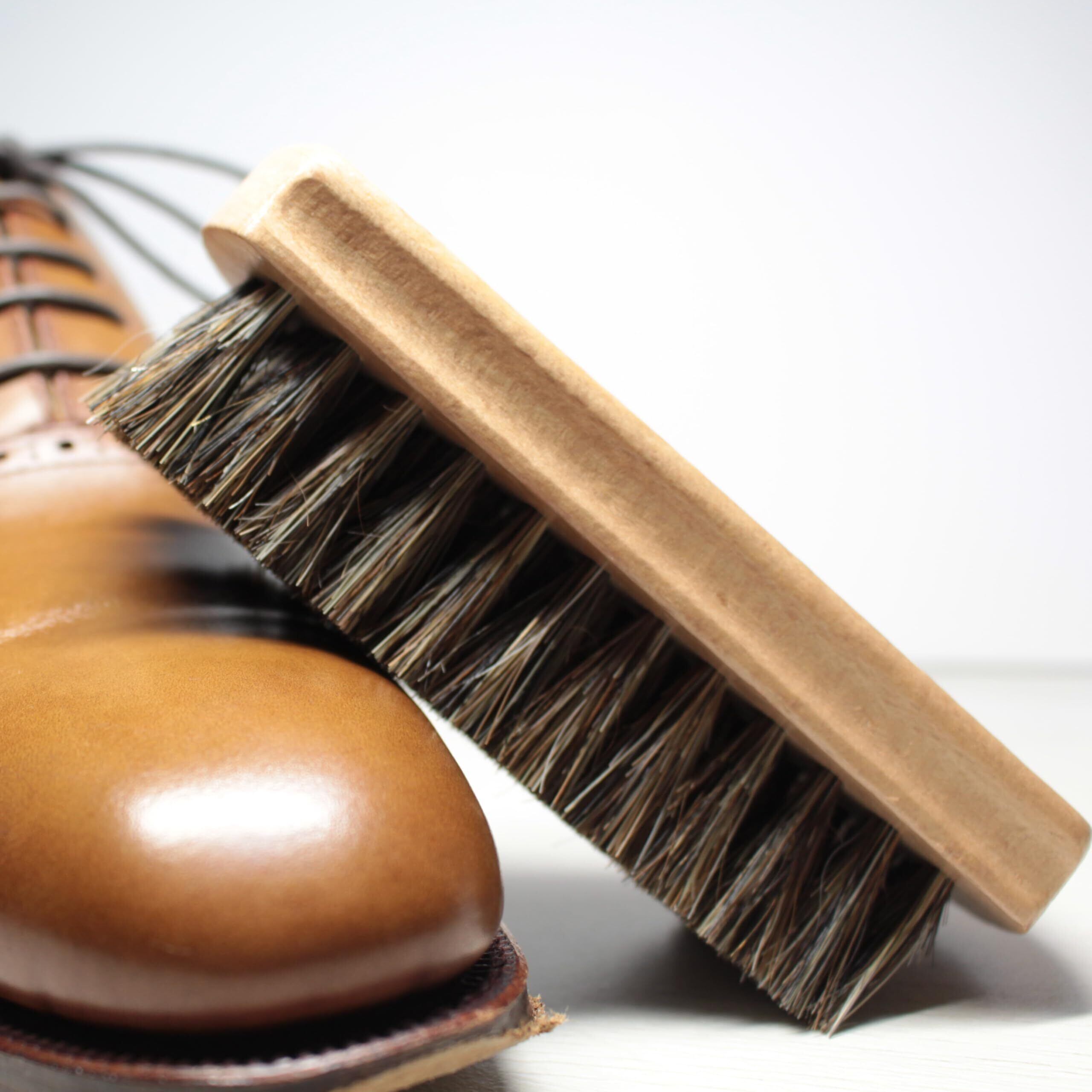 布 や スポンジ でクリームを添付した後の仕上げに 靴クリームを塗った後、 ブラッシングすると 靴になじみ、伸ばすことにより光沢もでます。馬毛は革靴に馴染みしっかりと靴に光沢感を与えます。