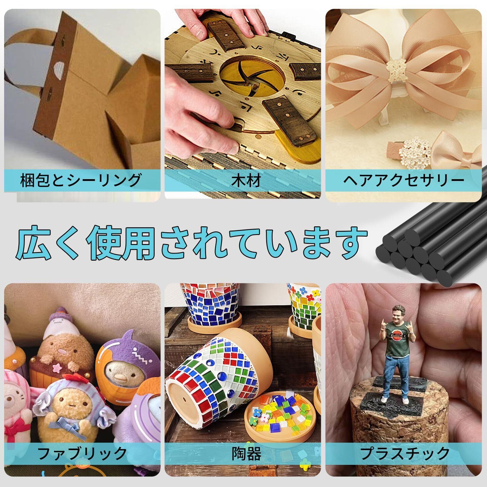 ワイドアプリケーション:ホットメルト接着接着剤スティックは、DIYアートクラフト、ホリデーデコレーション、一般的な修理、おもちゃ、ヘアアクセサリー、紙、木材、段ボール、フォーム、ガラス、テキスタイル、陶器、弦、プラスチック、プラスチックなど、パッケージングとシーリング、プラスチックに広く使用されています。金属など