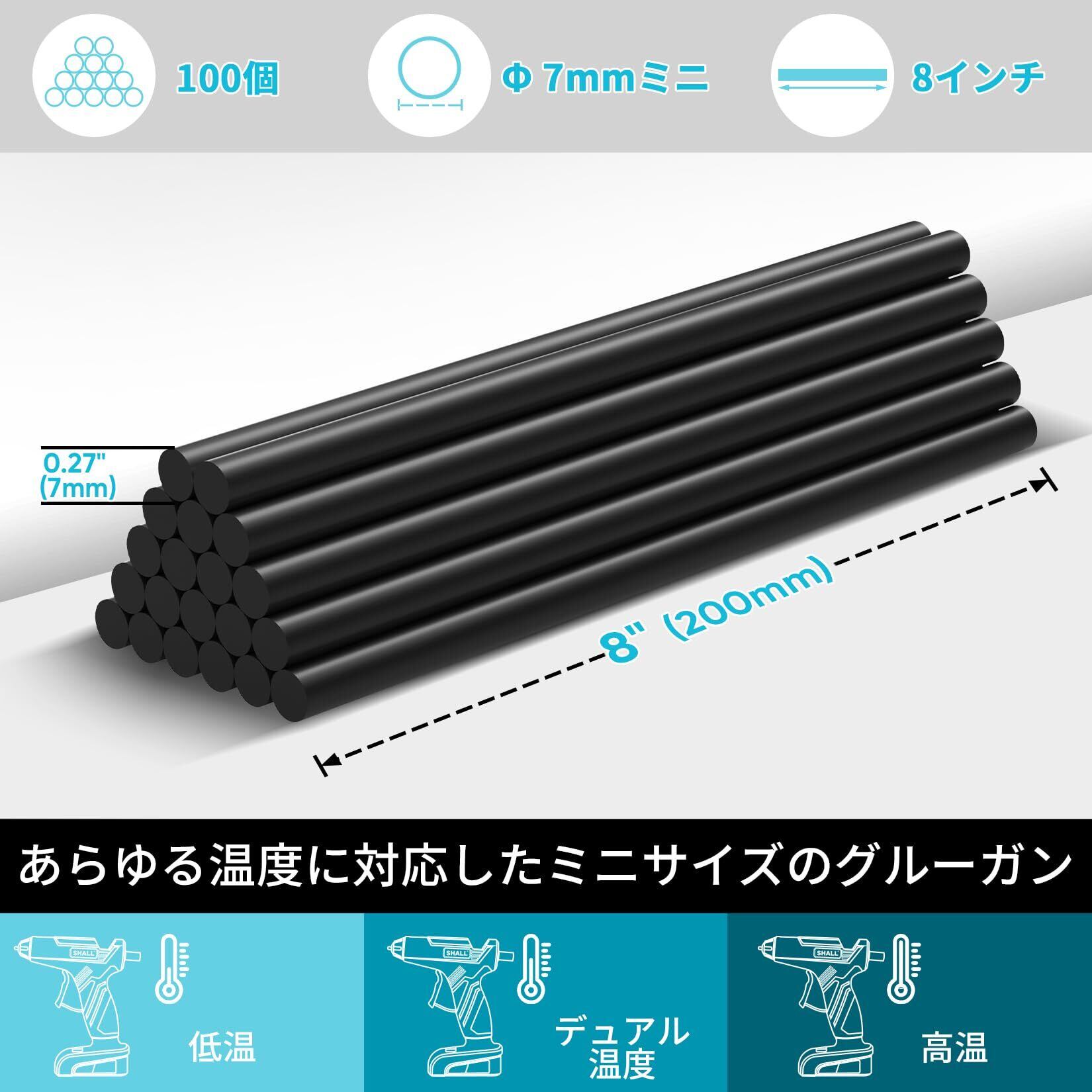 ユニバーサルサイズ:0.27 ''の直径x 8 ''の長さ(7 x 200 mm)の100パックの黒いミニホット接着剤スティックが付属しています。デュアル、低温)ミニホットグルーガン