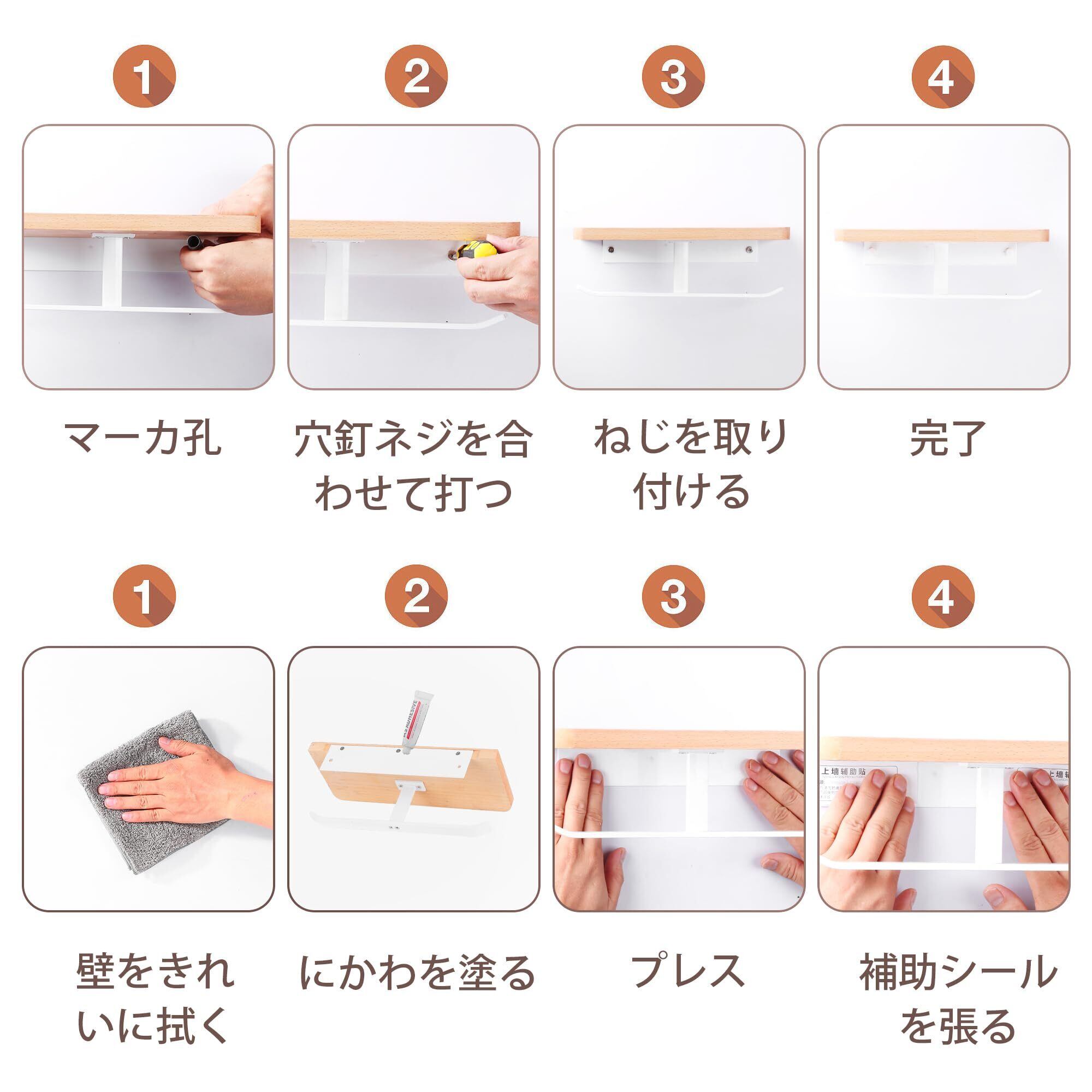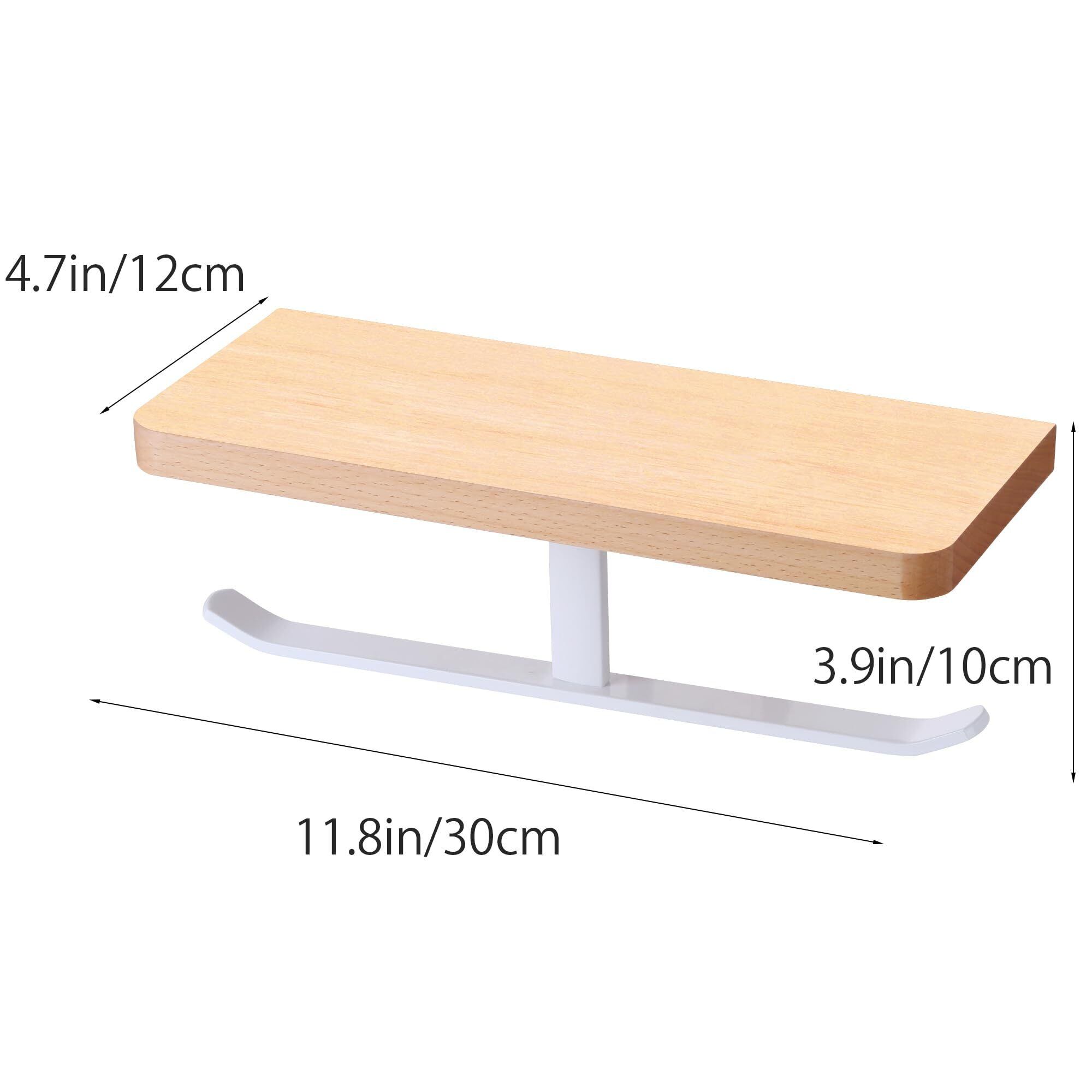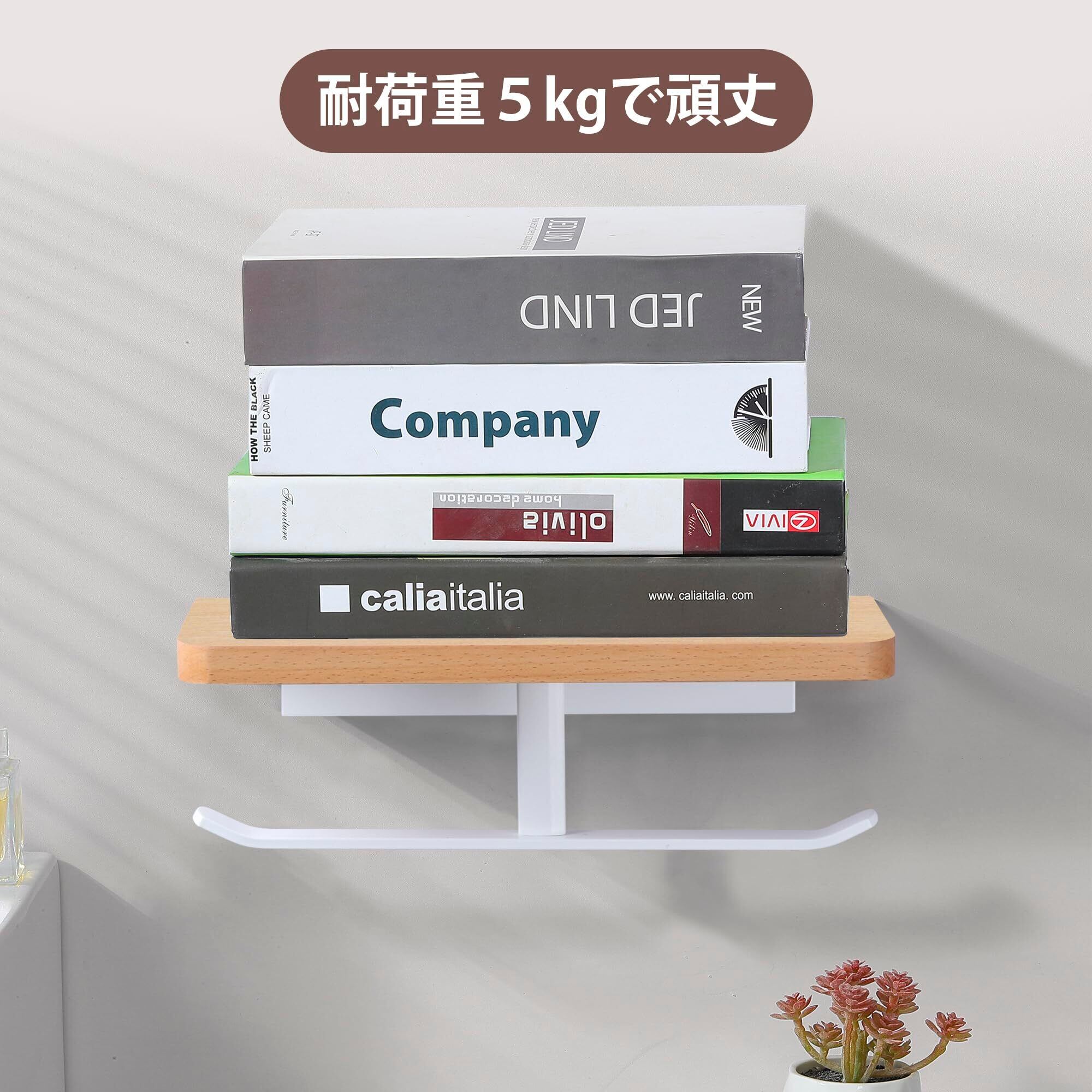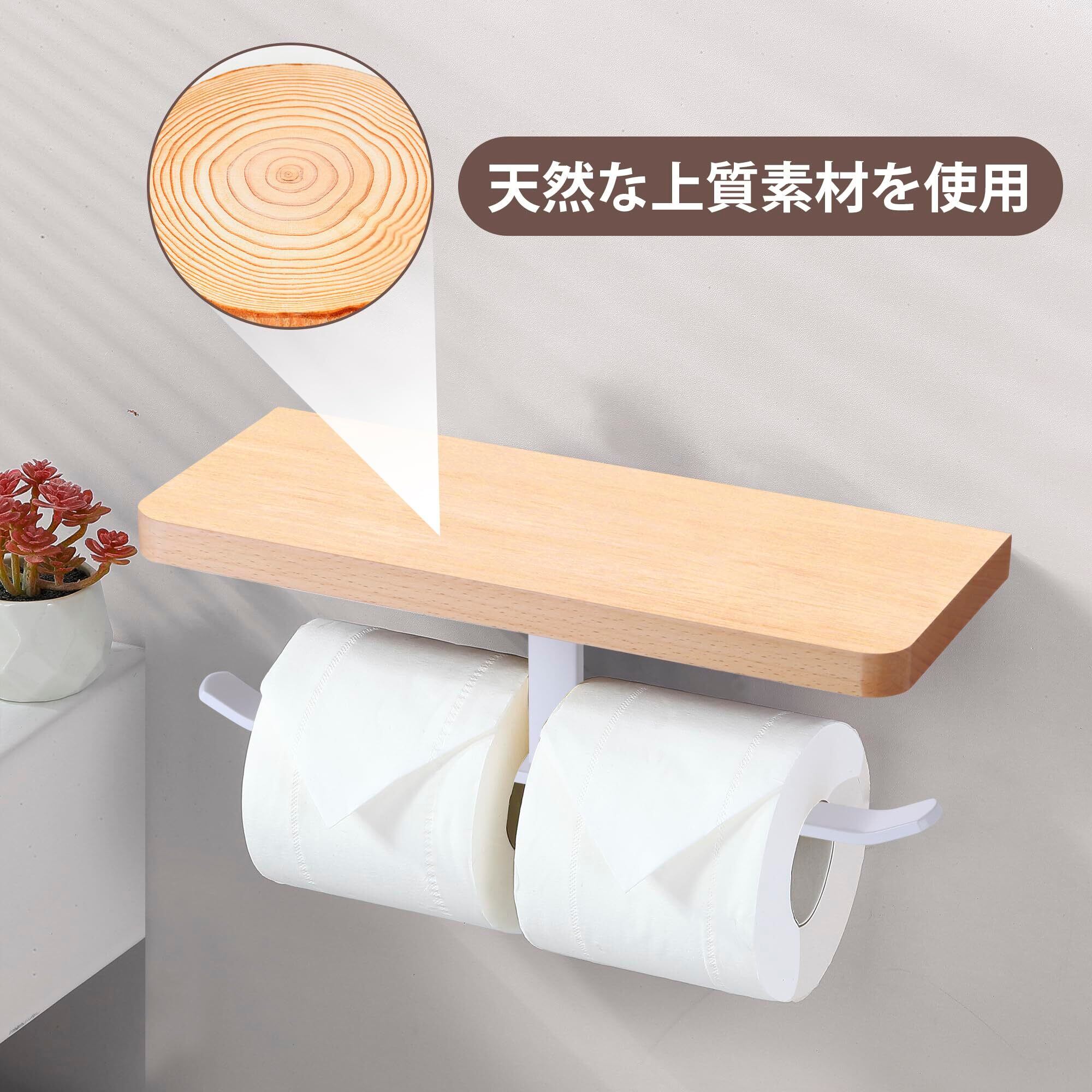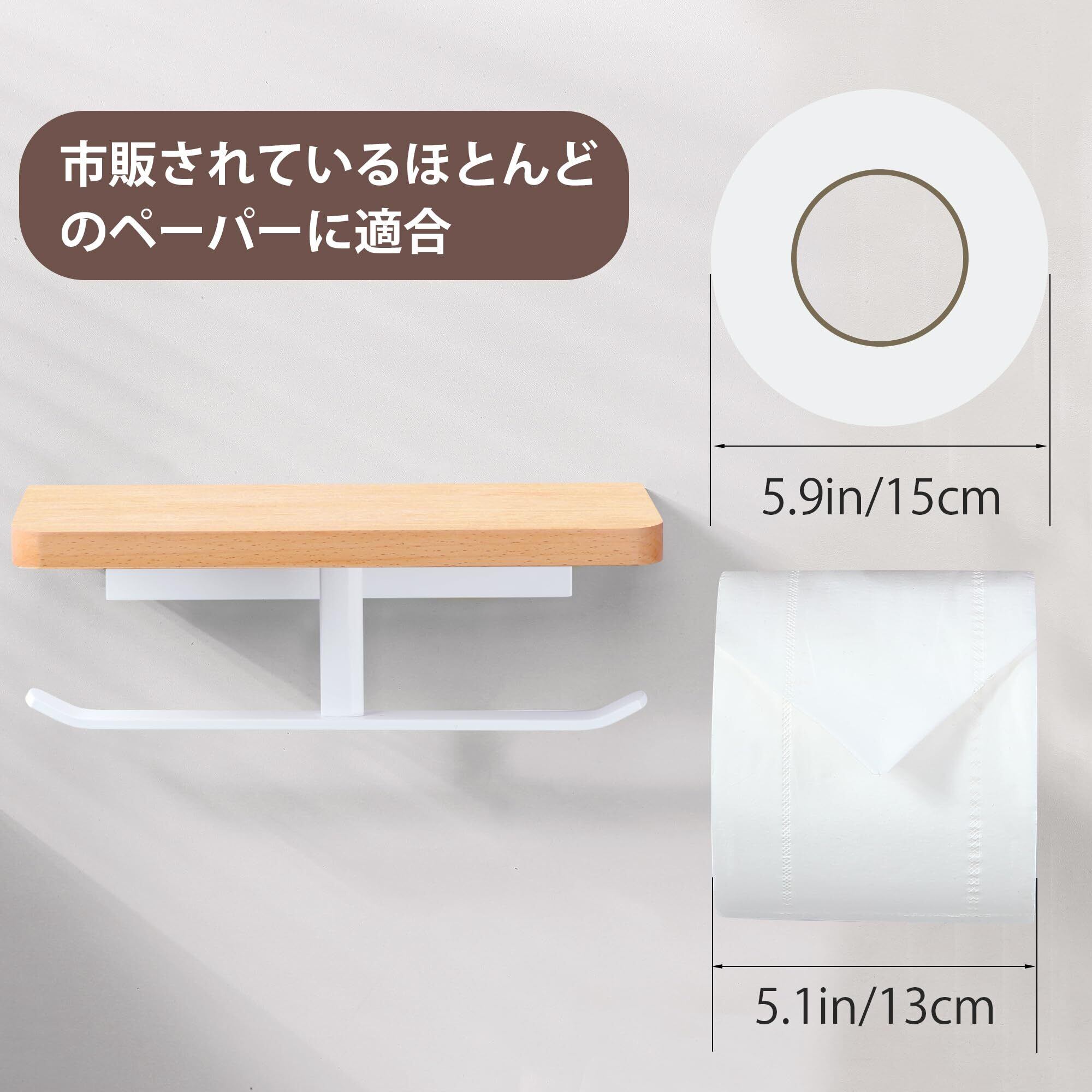 トイレットペーパーホルダー 紙巻器 小物置き/スマホ置き 汚れに強い天板付き 棚付き 取り付け簡単 壁掛け 穴あけ不要 貼り付け 横から簡単取り替え 天然木 おしゃれ 浴室 耐荷重約5kg ホワイトフック 白色