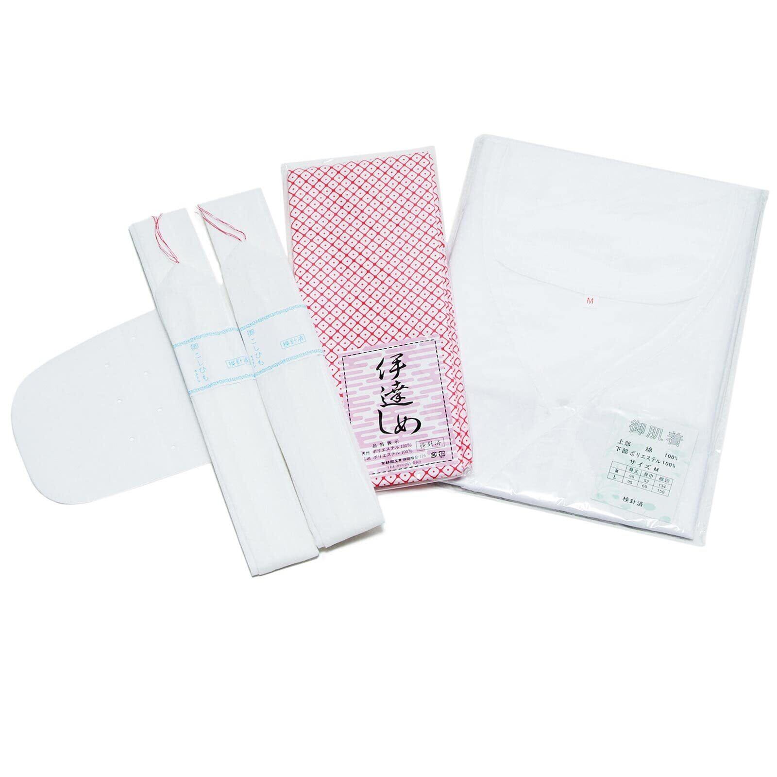 紐でしめるタイプのスリップに、腰紐2本、伊達締め1本、帯板1枚が入っています。スリップは日本製です。