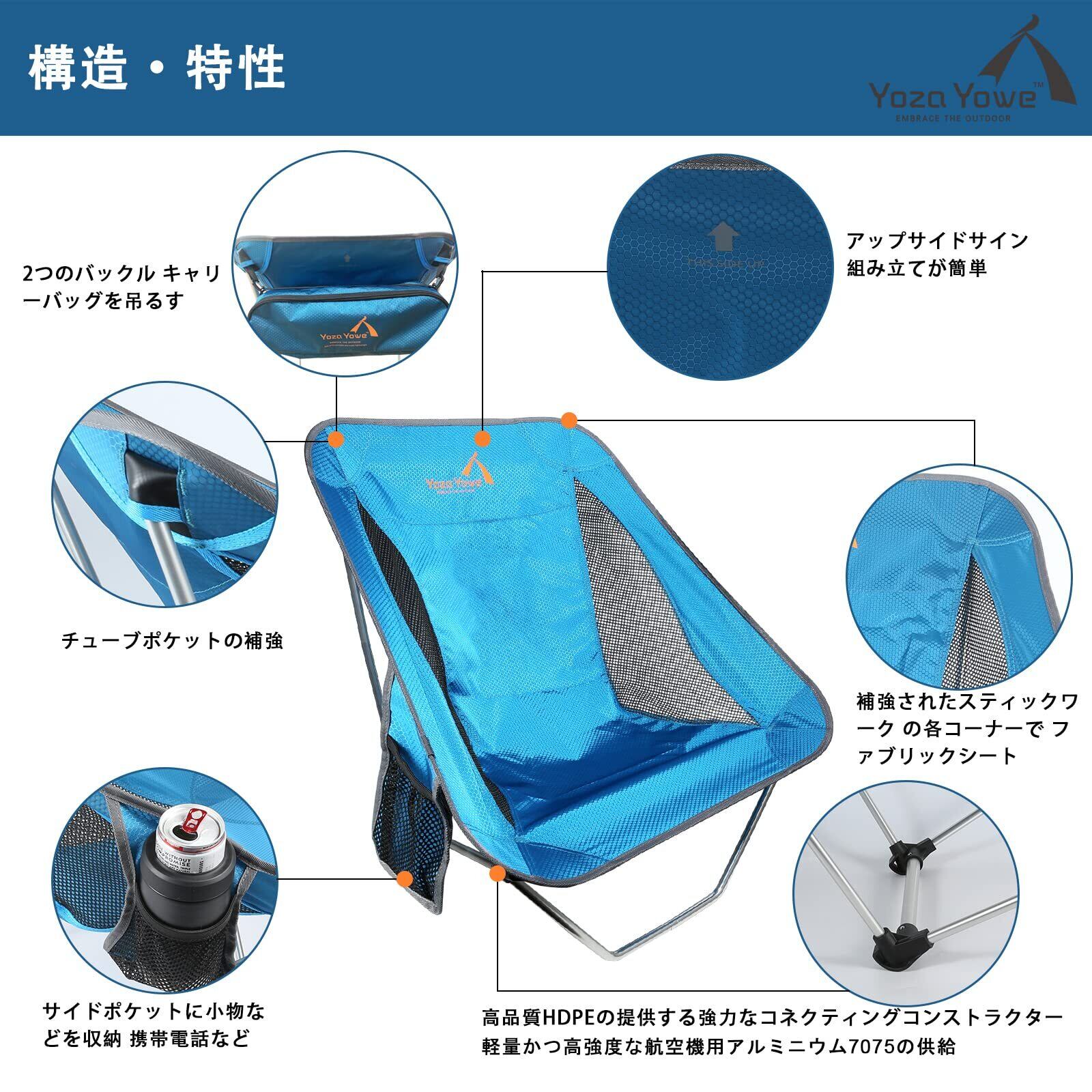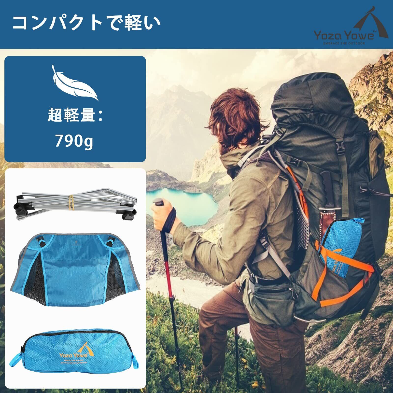 コンパクトで軽い:Yoza Yoweキャンピングチェアは、驚異的な軽さと耐久性超々ジュラルミンを採用 飛行機の機体も採用される材質。重量は790gだけ。 組み立て式なので、 收纳サイズは40センチメートル、完全にバックパックや機内持ち込み荷物のスーツを入れることができます