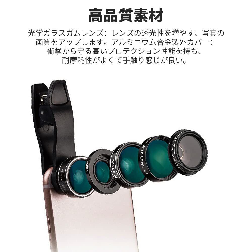 【高品質素材・セット内容】光学ガラスガムレンズ:レンズの透光性を増やす、写真の画質をアップします。アルミニウム合金製外カバー:衝撃から守る高いプロテクション性能を持ち、耐摩耗性がよくて手触り感じが良い。セット内容:1*広角レンズ(0.65x)、1*15Xマクロレンズ、1*180°魚眼レンズ、1*2望遠レンズ、1*星形フィルタ、1*取付けクリップ、レンズ収納バック×1。ご使用する前にレンズを付属のクリーニングクロスで綺麗に拭いてください。