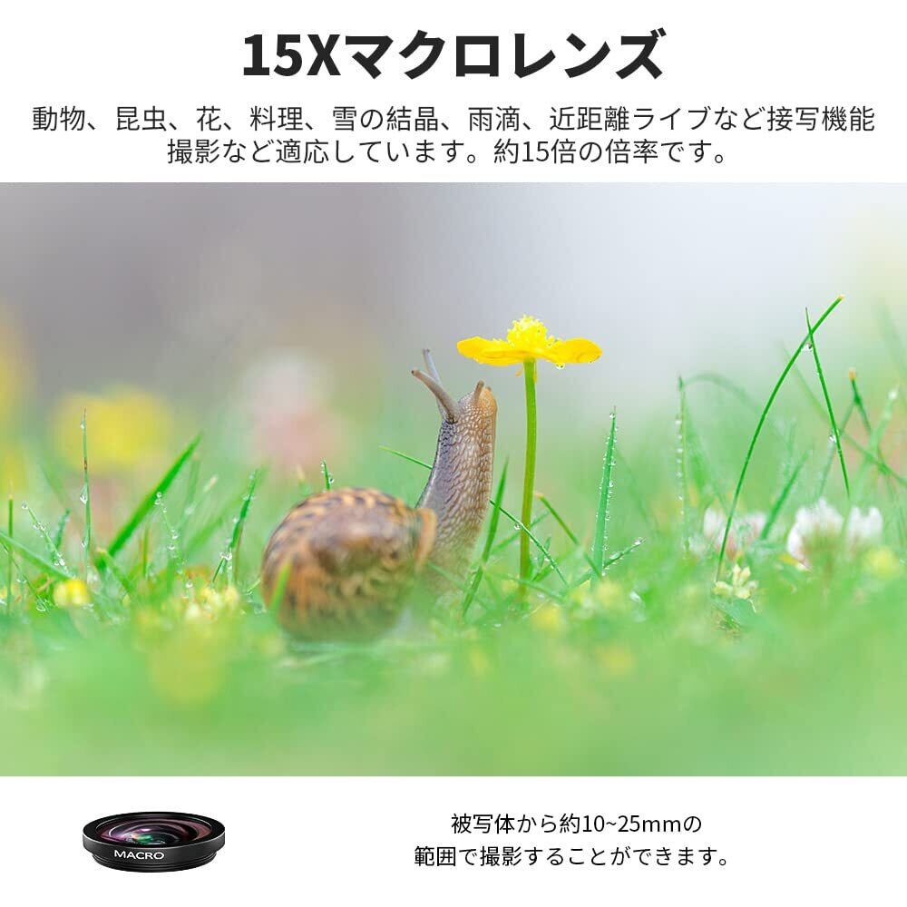 【15Xマクロレンズ・十分細部まで写す】動物、昆虫、花、料理、雪の結晶、雨滴、近距離ライブなど接写機能撮影など適応しています。約15倍の倍率です。被写体から約10~25mmの範囲で撮影することができます。マクロレンズを装着すると接写での撮影が可能になり、ネイルなど、小さな被写体に焦点を合わせて撮影可能です。レンズには、光の反射や映り込みを防ぎきれいに撮影できるAR加工を施しています。
