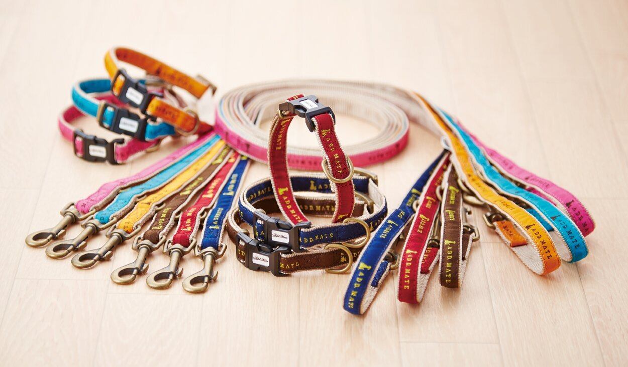 シンボルマークをデザインしたヴィンテージ風の犬具が復刻。仮つなぎや短引きが可能。(全長120cM)