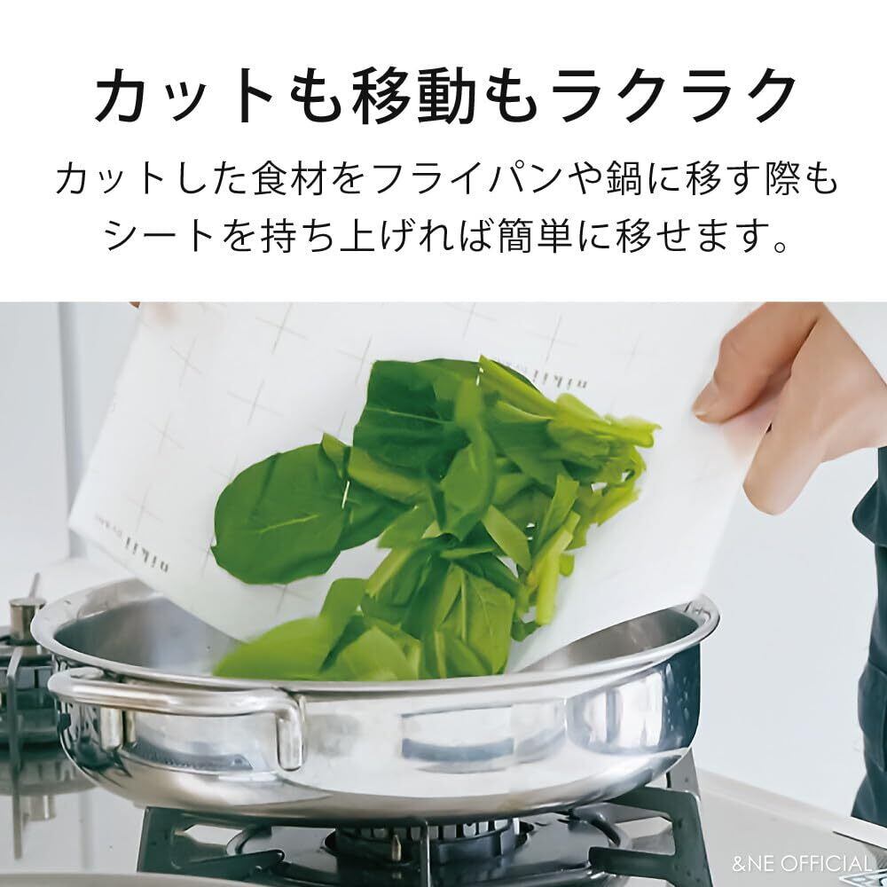 カットした食材をフライパンや鍋に移す際もシートを持ち上げれば簡単に移せます。シートのデザインには3cm角の十字が敷き詰められており、均一なカットの目安に
