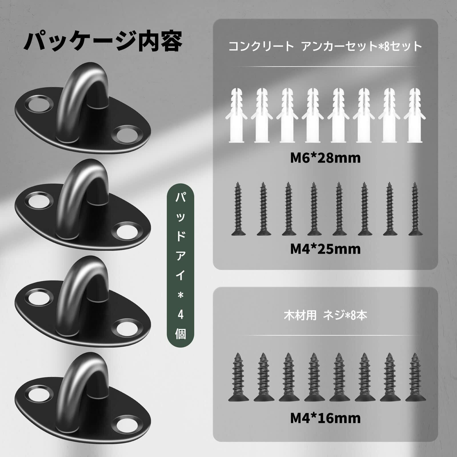 パッケージ内容:4個アイプレート、コンクリート用ネジ&アンカーセット*8セット、木材用ネジ*8個。