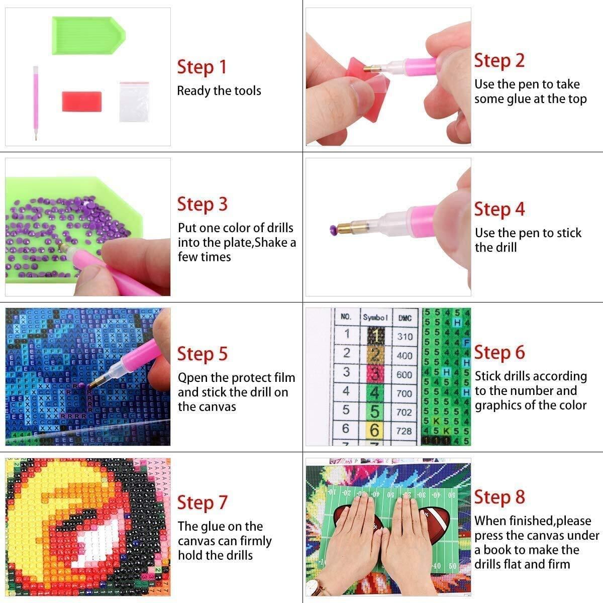 【作り方は簡単】ペン先をピンクのグルーを付けて台紙にビーズと同じ記号または英数字を貼り付けるだけでキラキラなダイヤモンドアートが仕上がります。クロスステッチ刺しゅうより気軽になり、集中力がUP、達成感もじゅうぶん味わっていただけます。