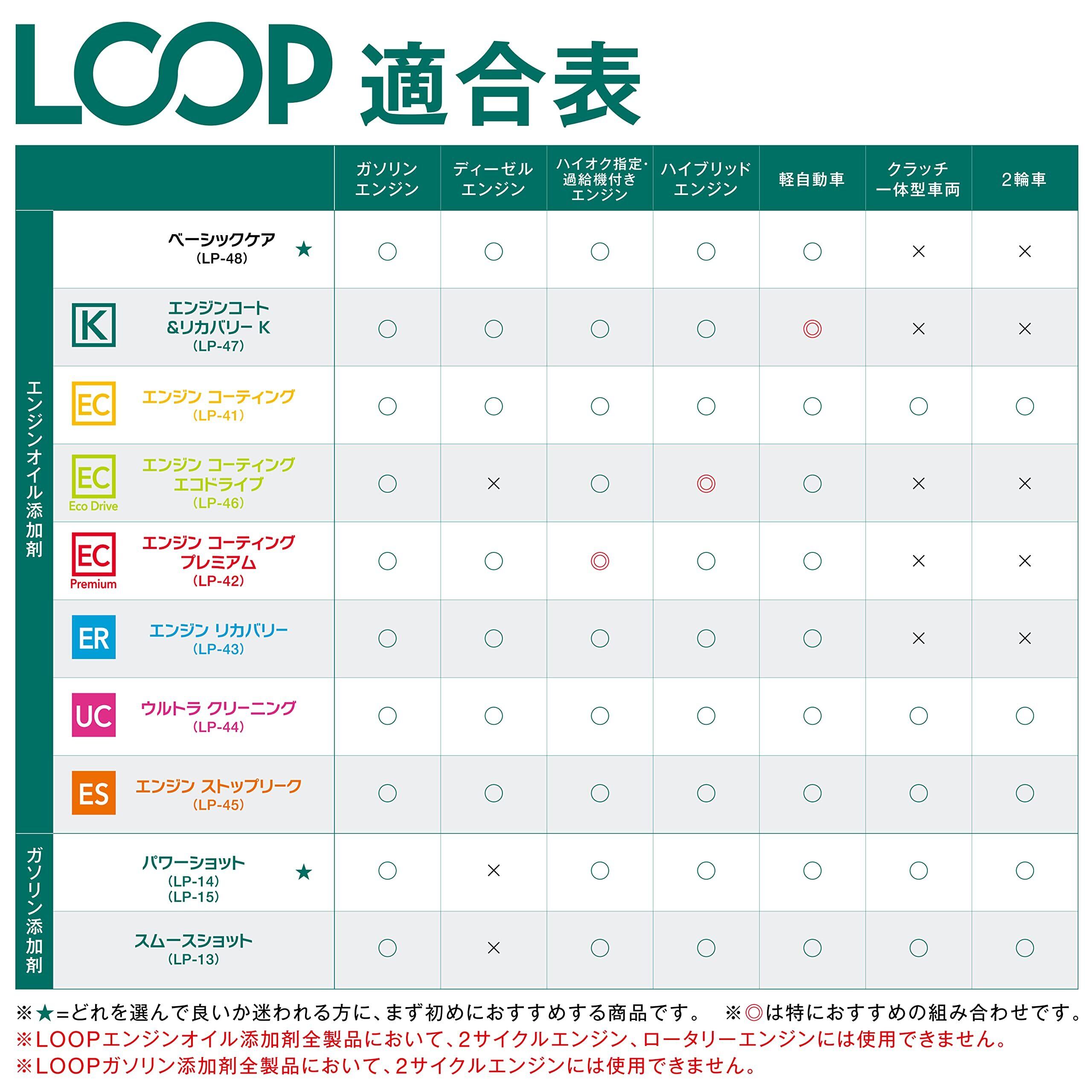 ループ パワーショットに二輪用サイズが登場!13L~20Lのタンクに本品1本を添加してください。高純度PEAとPIBAをダブル配合。燃焼室、インジェクター、吸気バルブに付着した汚れを除去し、完全燃焼を促進することによりスムーズなアクセルレスポンスを回復します。燃費悪化やアイドリング不調の原因となる汚れを除去し、ハードなカーボン&スラッジまでも除去。エンジンコンディションを最適な状態に戻します。さらに、コーティング効果でデポジットが付きにくくします。