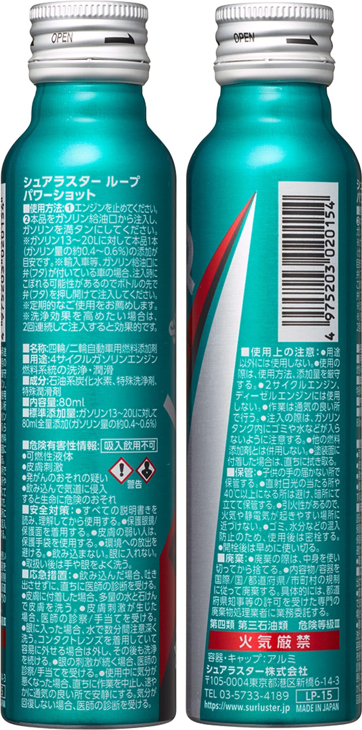 SurLuster(シュアラスター) ループ パワーショット 80ml ガソリン添加剤 バイク 4サイクル PEA PIBA 特殊潤滑剤配合 洗浄系燃料添加剤 燃費改善 振動軽減 レスポンス回復 エンジン内洗浄効果 LP-15
