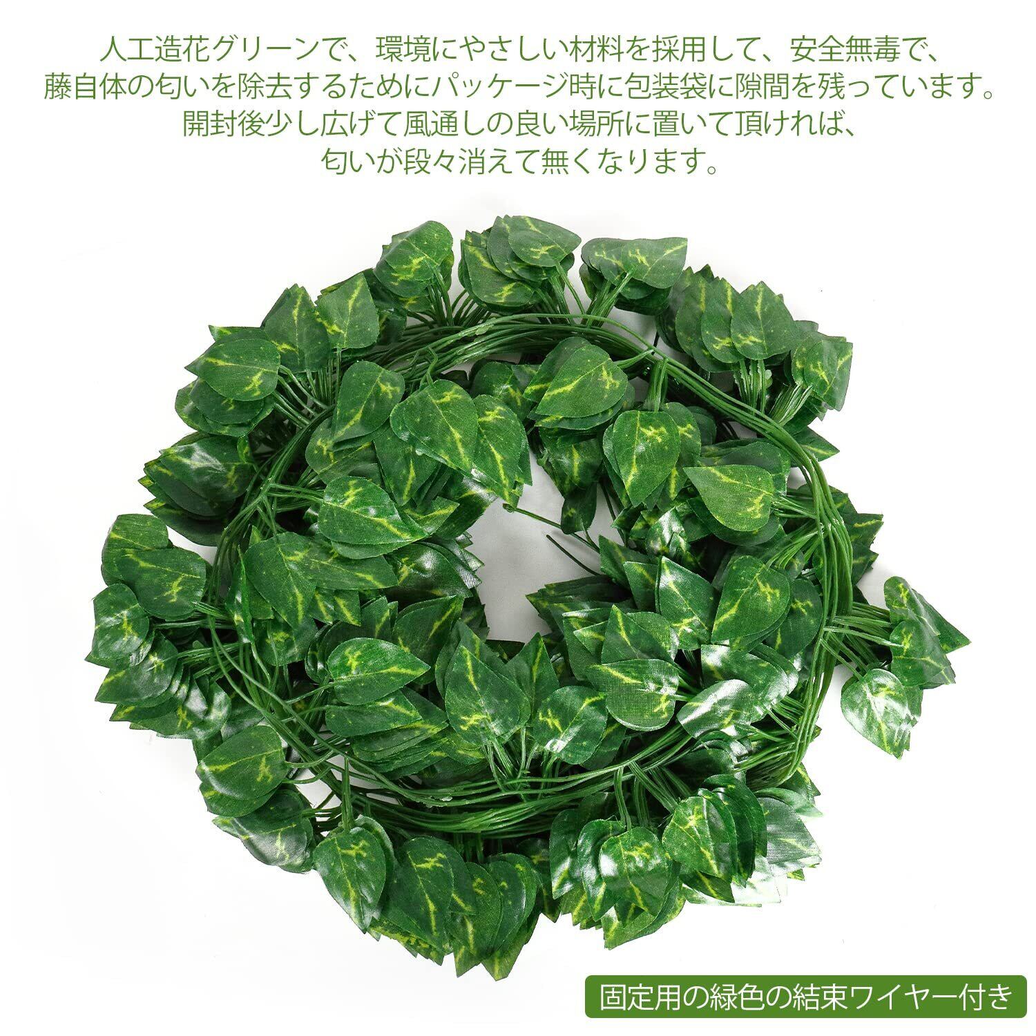 ✿仕様概要:フェイクグリーンは24本入り、12本づつ束になって、長さは2メートルで、1本毎に約80枚の葉っぱは茎の左右に均一に分布しています。葉っぱは特別のハート形状で超可愛いです。何箇所に分けて使え、何本に合わせて飾り付けるとより雰囲気を出せます。
