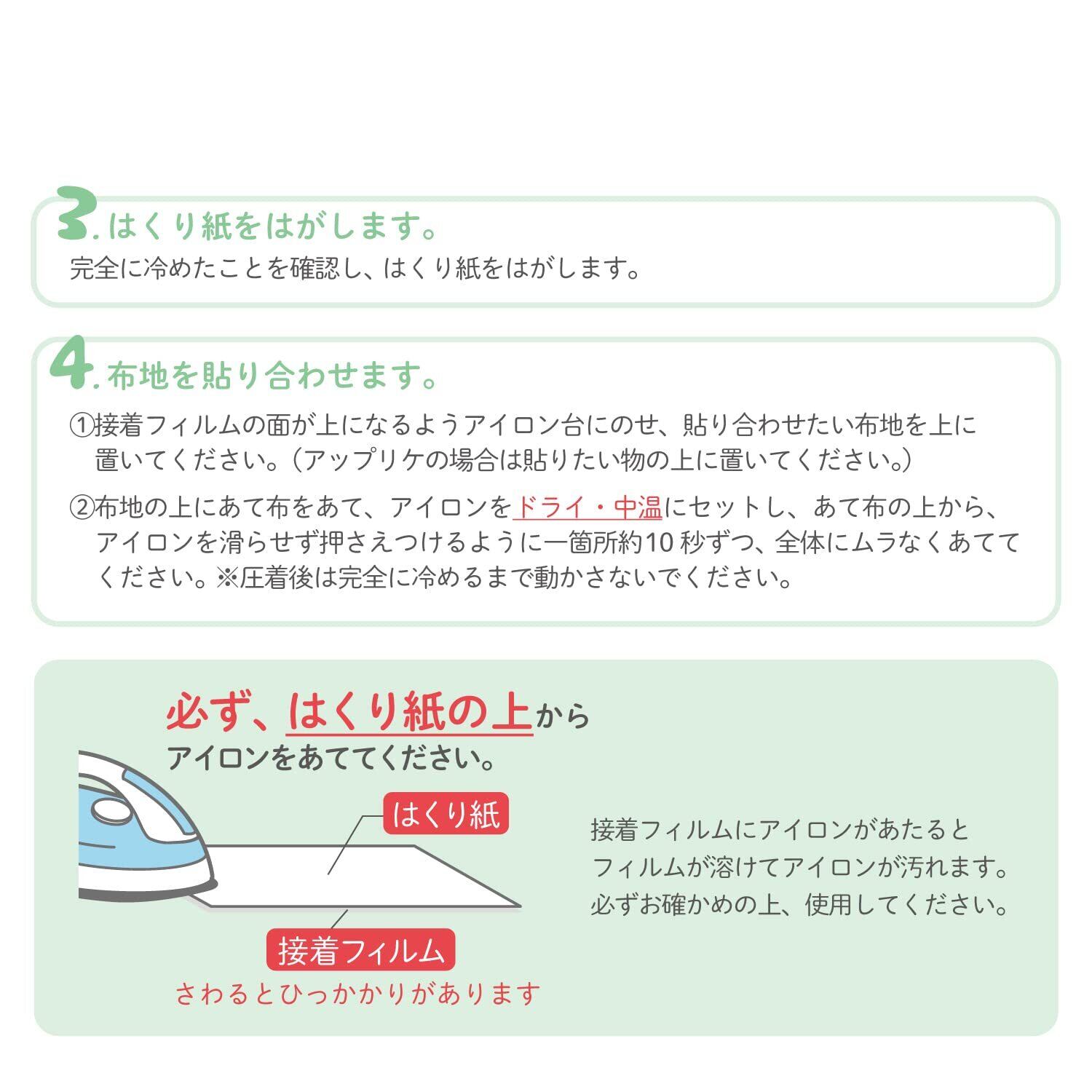 ※接着フィルム(さわるとひっかかりがあります)にアイロンが当たるとフィルムが溶けてアイロンが汚れます。