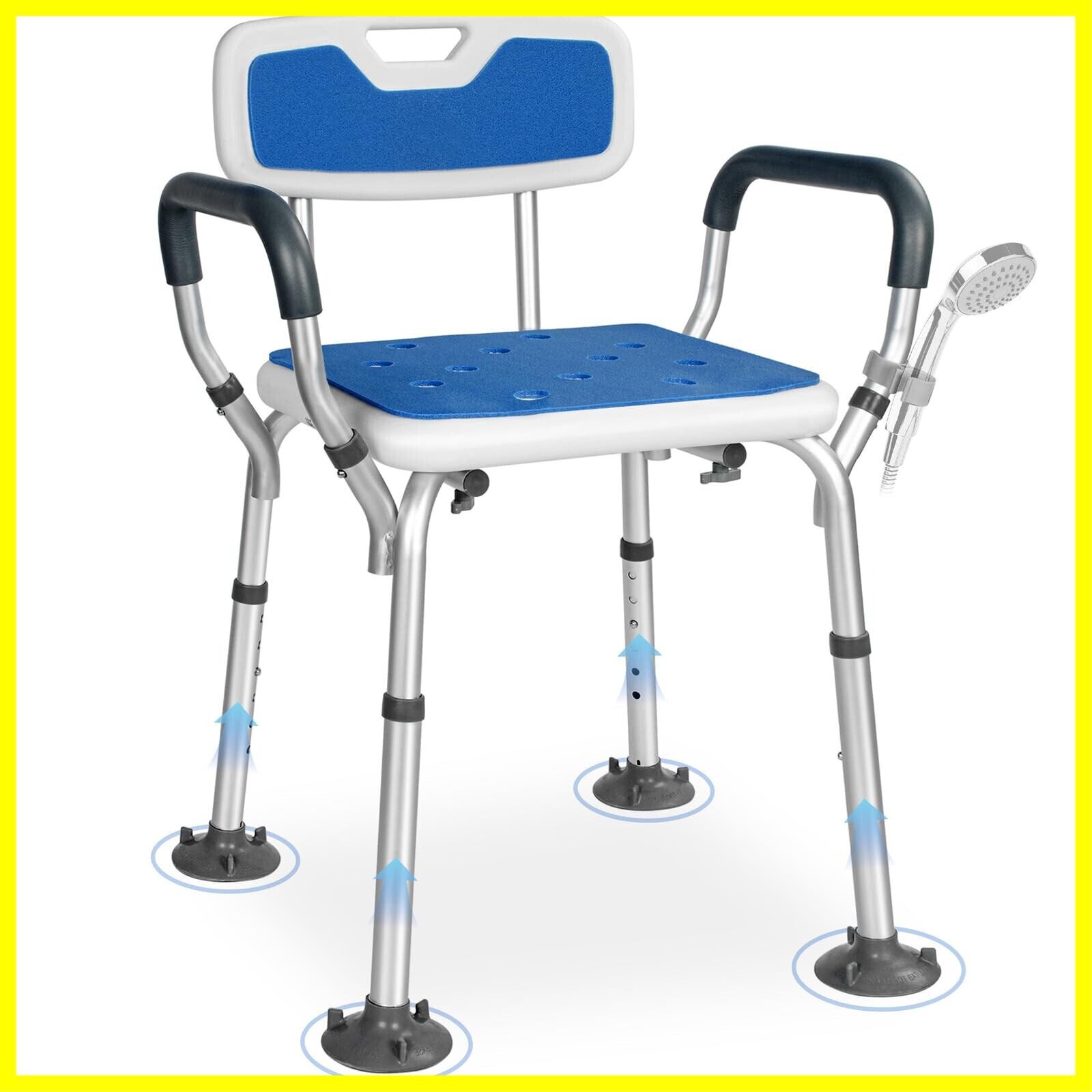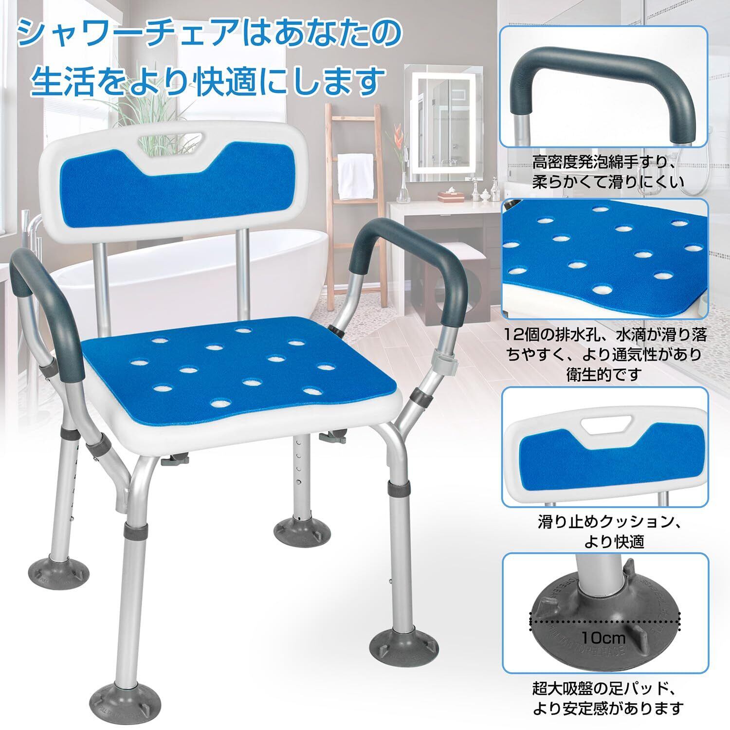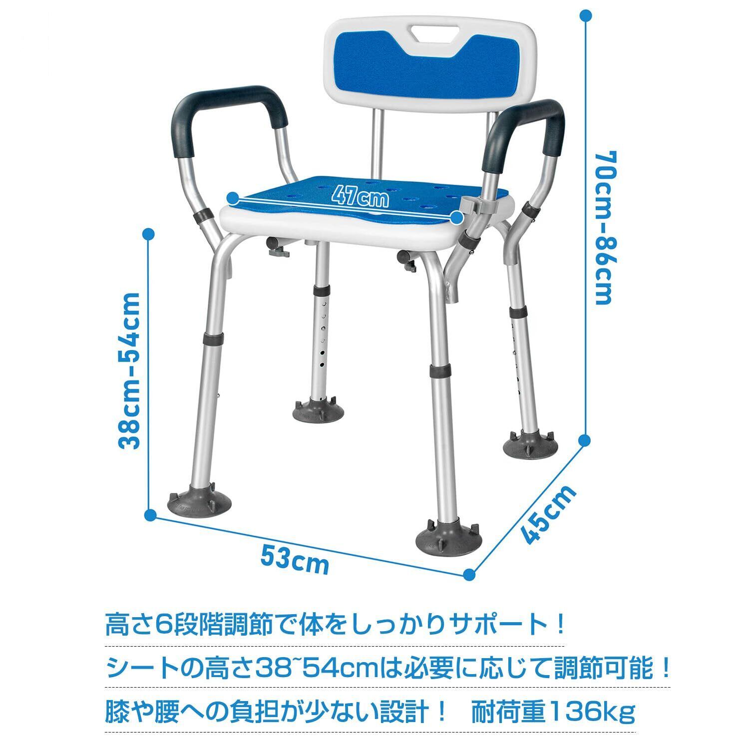 大吸盤 シャワーチェア お風呂椅子 介護用 6段階高さ調節可能 背もたれ付き 手すり 取り外し可能 アルミ合金フレーム 軽量 丈夫 シャワー用 介護ダイニングチェア 耐荷重136kg 日本語説明書付き