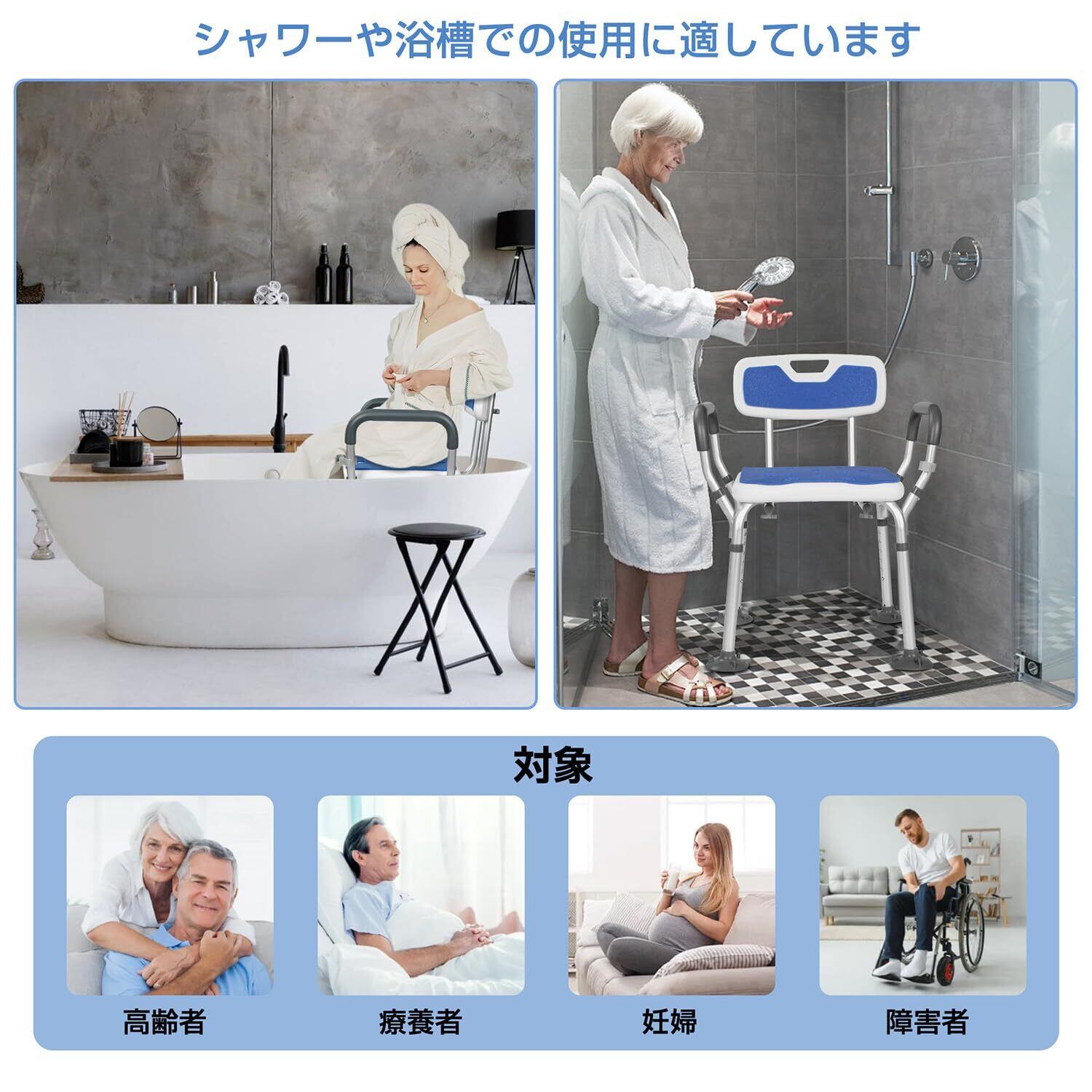 【適用者】この介護用の大吸盤シャワーチェアは高品質のアルミニウム合金で作られており、シャワー時の安全性と快適さを高めるために設計されており、さまざまな人々、特に追加のサポートが必要な高齢者、妊婦、障害者、行動不便者に適している。
