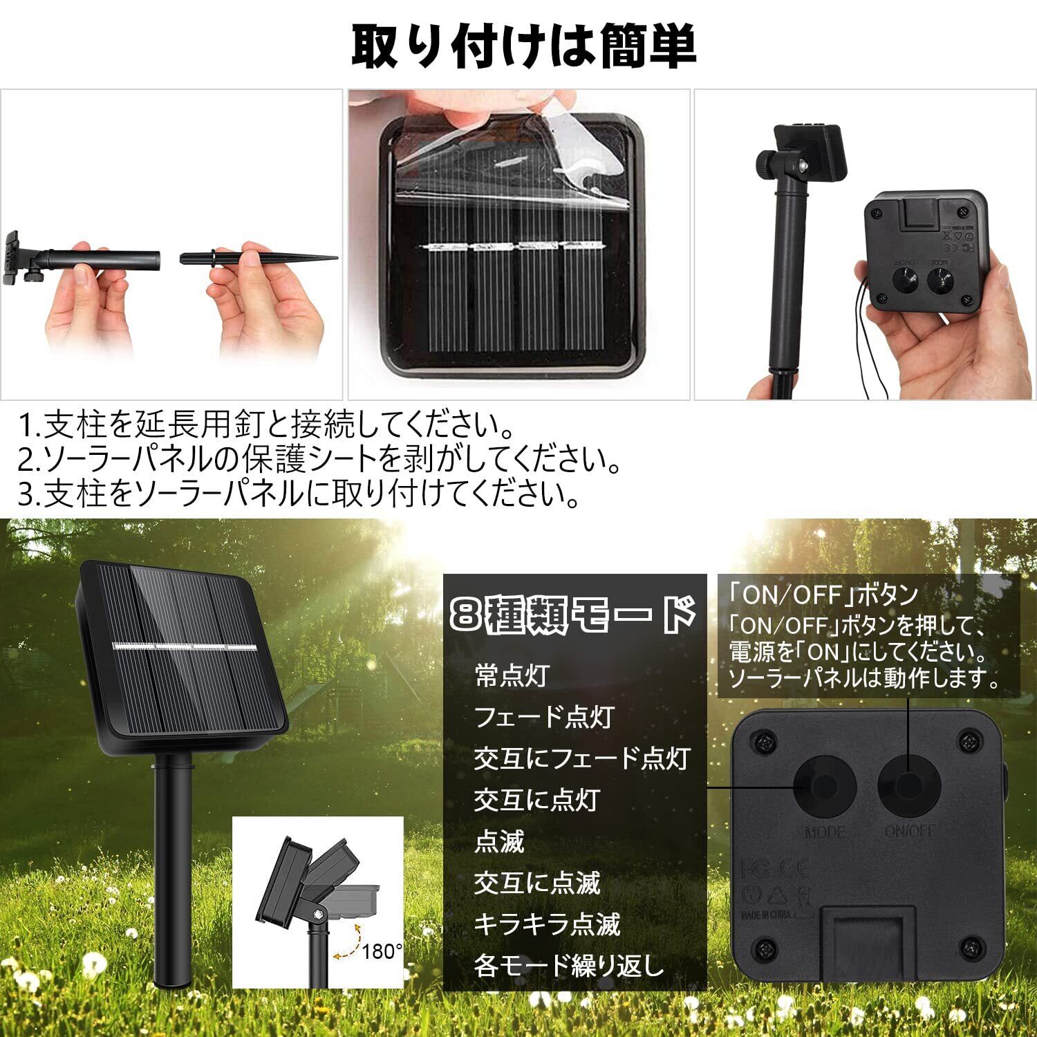 【電気代0円・省エネ】太陽光発電、ソーラーパネルに600mAhのバッテリーが内蔵されて、追加の電力コストは不要、フル充電の場合は、ストリングライトは夜間に自動的に10時間点灯します。LEDなので熱を持たないため熱くなりません。省エネの上に環境に優しい!