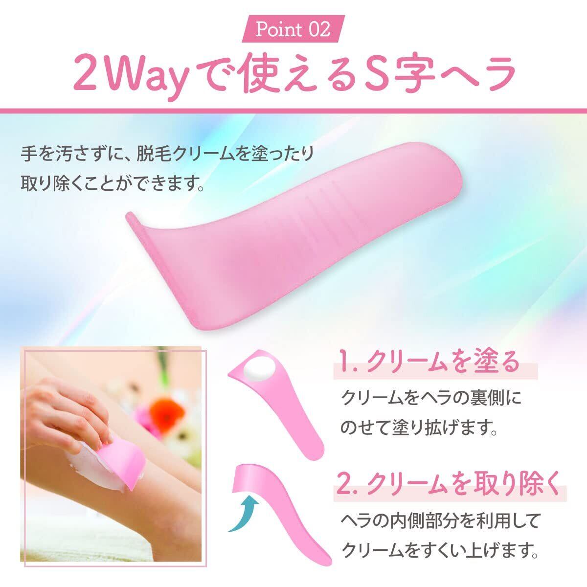 【使いやすいS字ヘラ】クリームを塗るときと取り除くときの両方でご使用いただけるスパチュラです。ヘラを使うことでクリームを効果的に伸ばすことができて、塗りムラを少なくすることができます。※クリームを取り除いた後は最後にシャワーなどでキレイに洗い流してください。