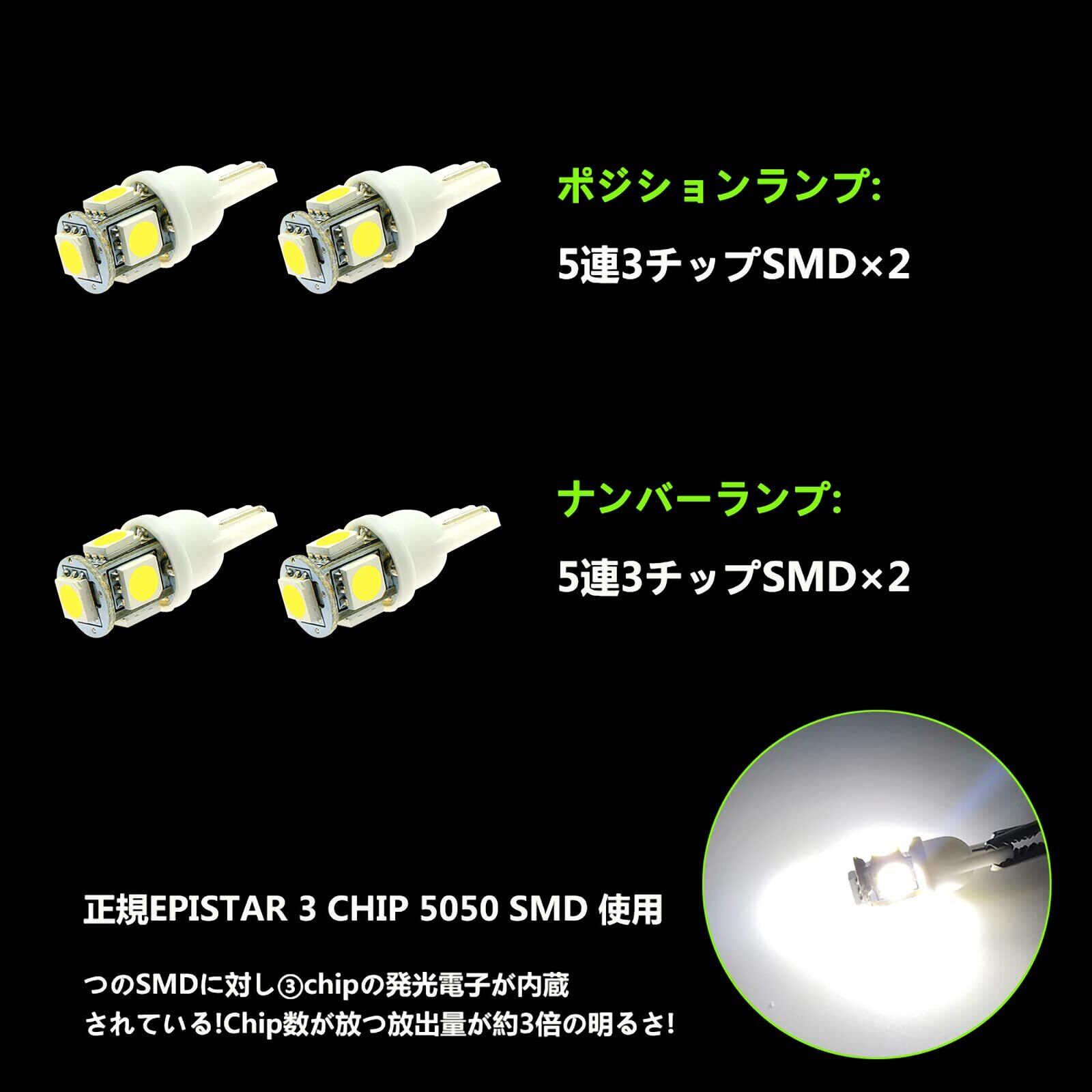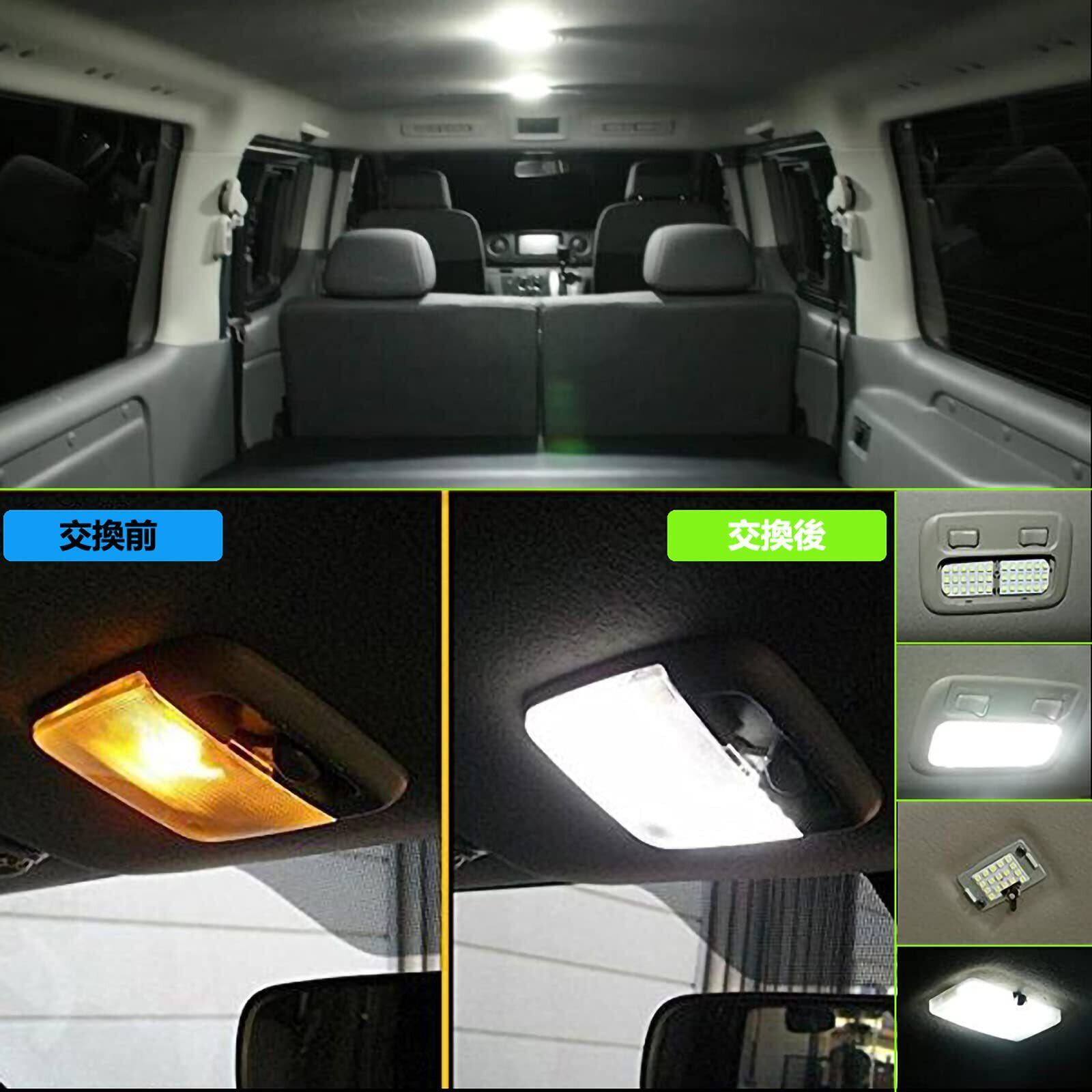 【製品パッケージ内容】 フロントランプ: 18発3チップ 5050 SMD×2、ミドルランプ: 52発3チップ 5050 SMD×1、サードランプ: 52発3チップ 5050 SMD×1、ラゲッジランプ: 17発3チップ 5050 SMD×1、ポジションランプ: 5発3チップ 5050 SMD×2、ナンバーランプ: 5発3チップ 5050 SMD×2、内張剥がし工具の付属×1、取り扱い説明書×1