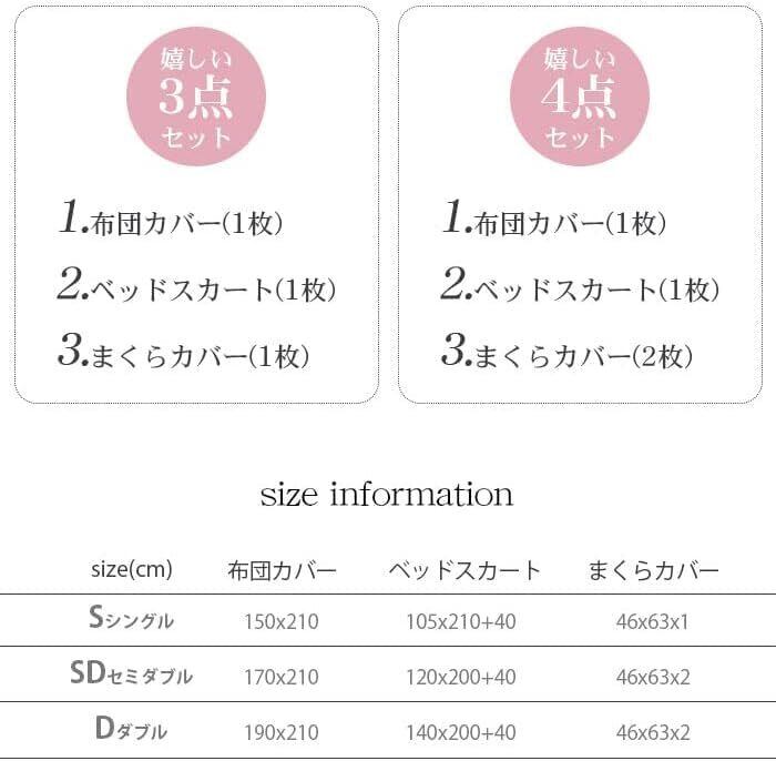 シングル 3点セット 掛け布団カバー(1枚)、150X210cm ・ベッドスカート 100X200+40cm 枕カバー(1枚) 46X63cm セミダブル 4点セット内容と仕様 掛け布団カバー(1枚)、170X210cm ・ベッドスカート 120X200+40cm 枕カバー(2枚) 46X63cm ダブル 4点セット 掛け布団カバー(1枚)、190X210cm・ベッドスカート 140X200+40cm 枕カバー(2枚) 46X63cm