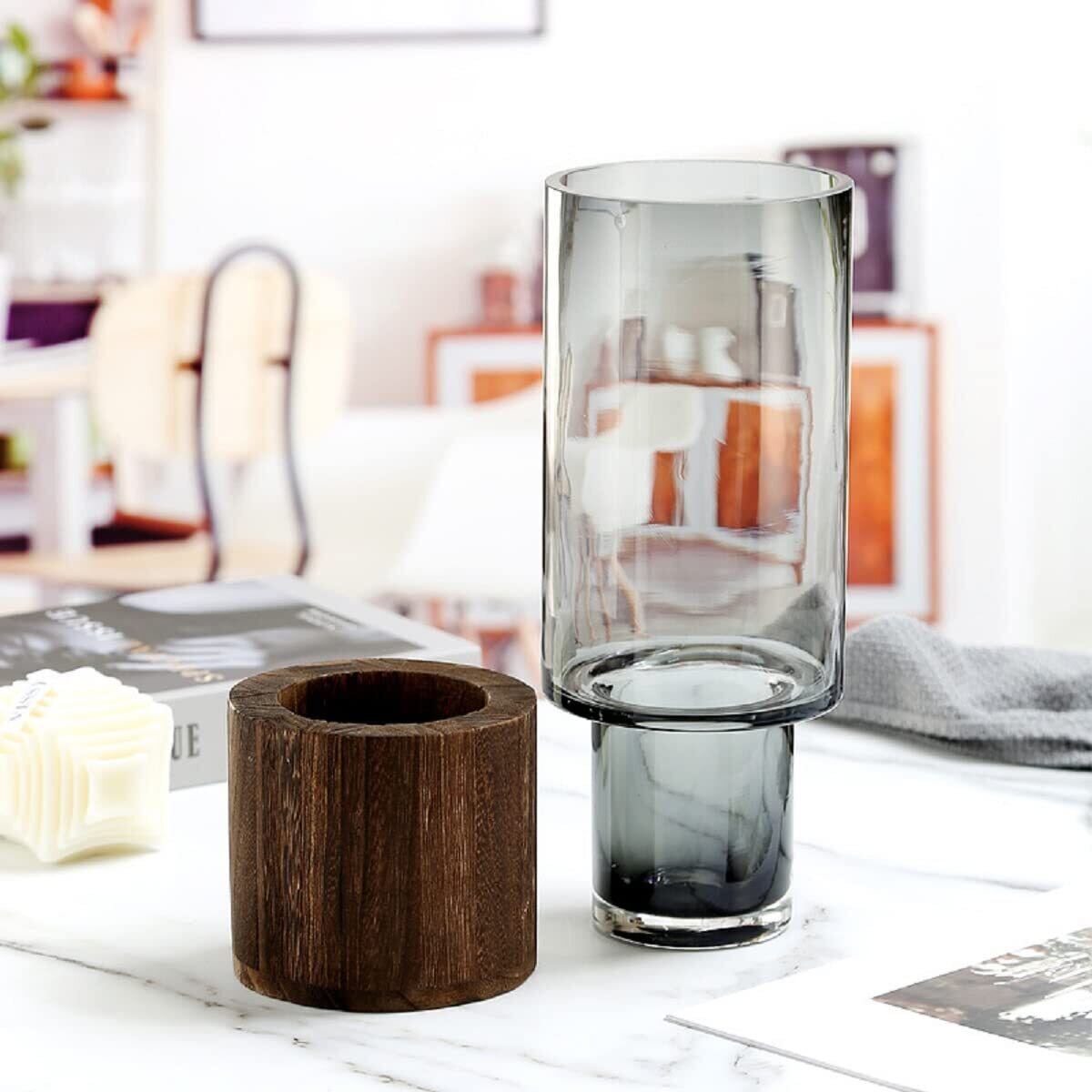 花瓶 ガラス 木製 フラワーベース 北欧 おしゃれ 花器 透明 ブラック グレー 大きい 花びん シンプル 高さ25cm 30cm 北欧 インテリア リビング 寝室オフィス (高さ:26cm)