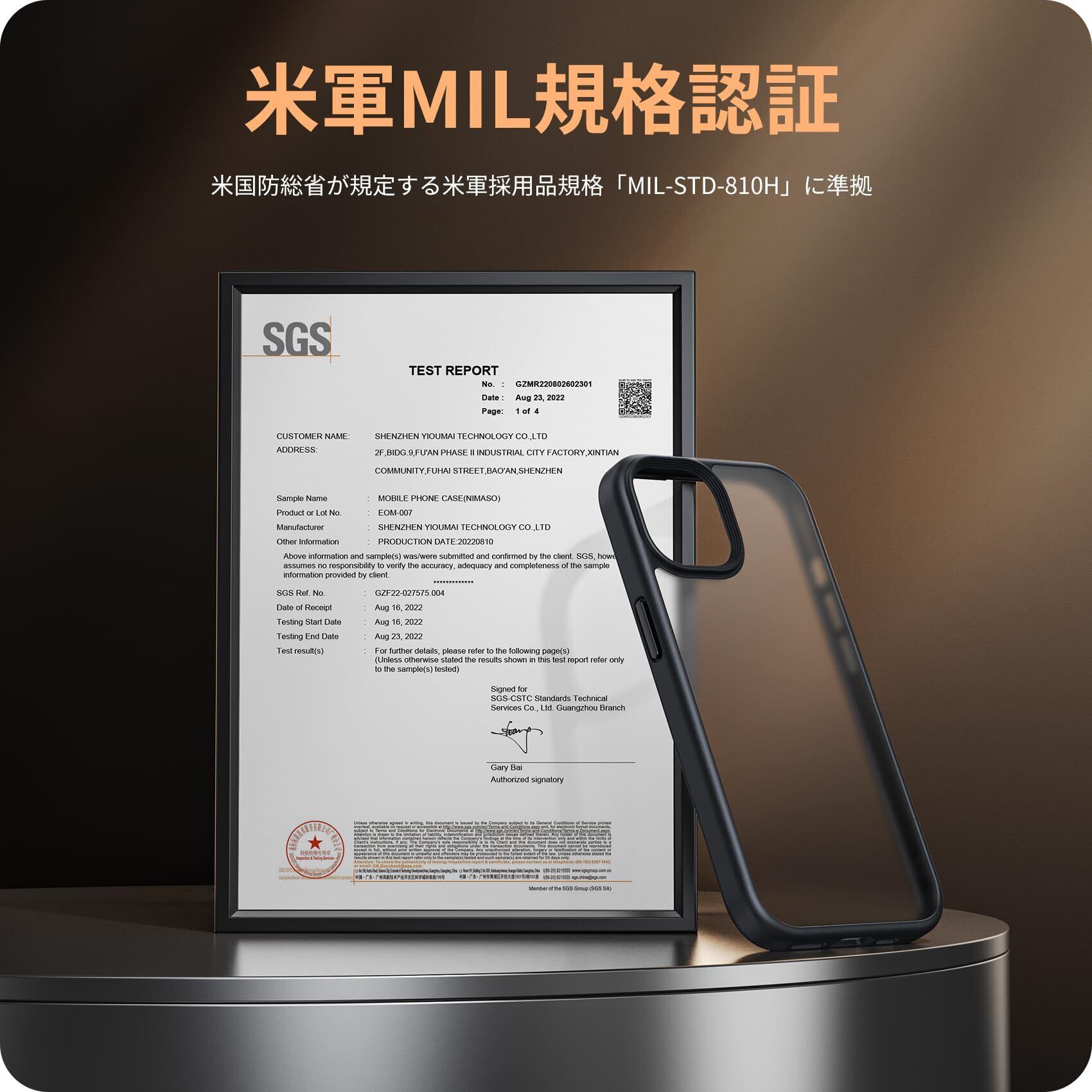 【米国MIL規格取得・耐衝撃性】世界で有名な米国防総省が規定する米軍採用品規格「MIL-STD-810H」に準拠。(認証番号:GZMR220802602301)。1.22mの高さからコンクリートの地面に厚さ5mmの合板を敷き、それぞれ違う角度から合計26回落下させても、本体は無傷です。高い耐衝撃性を誇り、iphone15plusを全方位からしっかりと守ります。