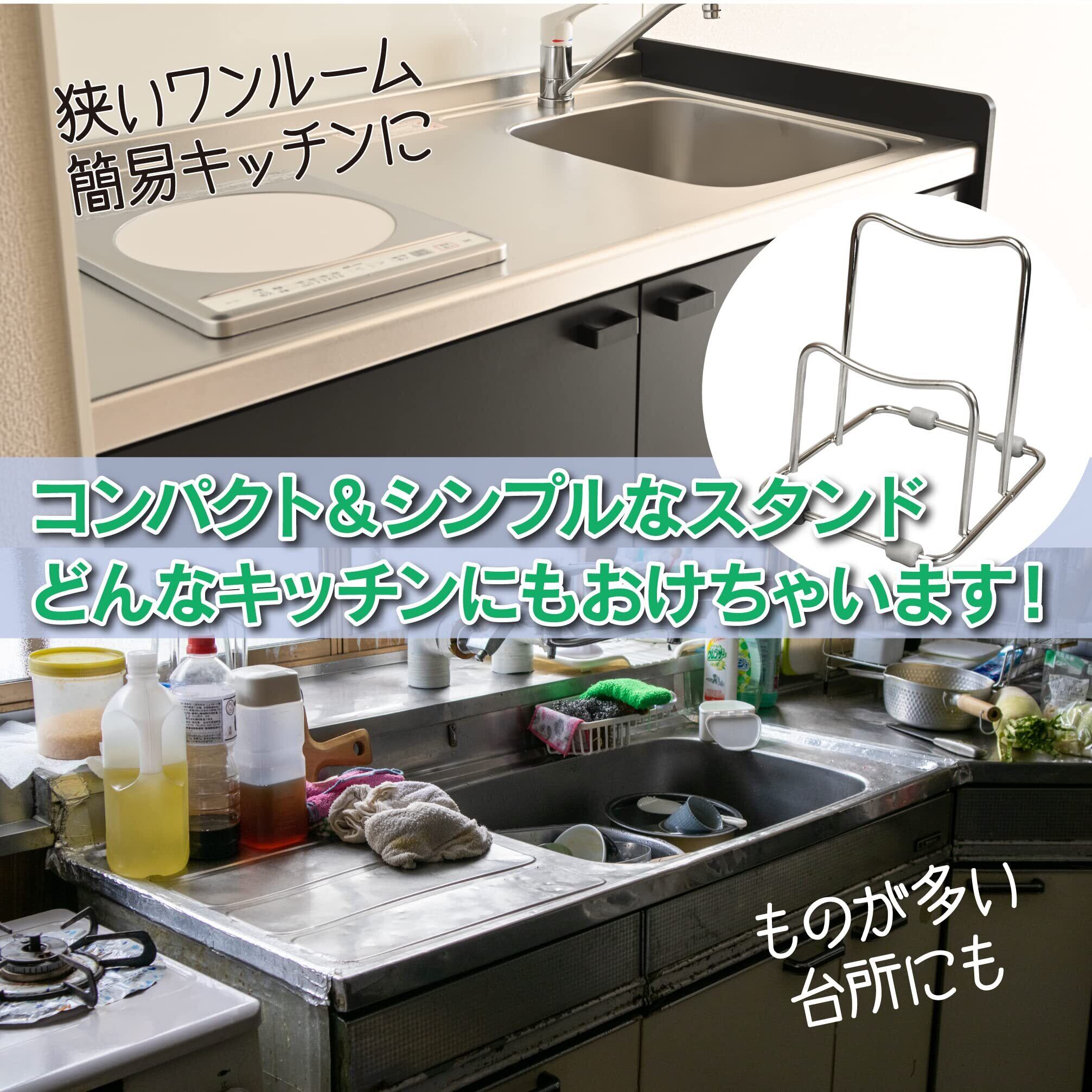 【狭いキッチンにも置けます】支柱部分に傾斜と高さを持たせることで台座部分がコンパクトでもまな板をしっかり支え、狭い場所にも設置できます。