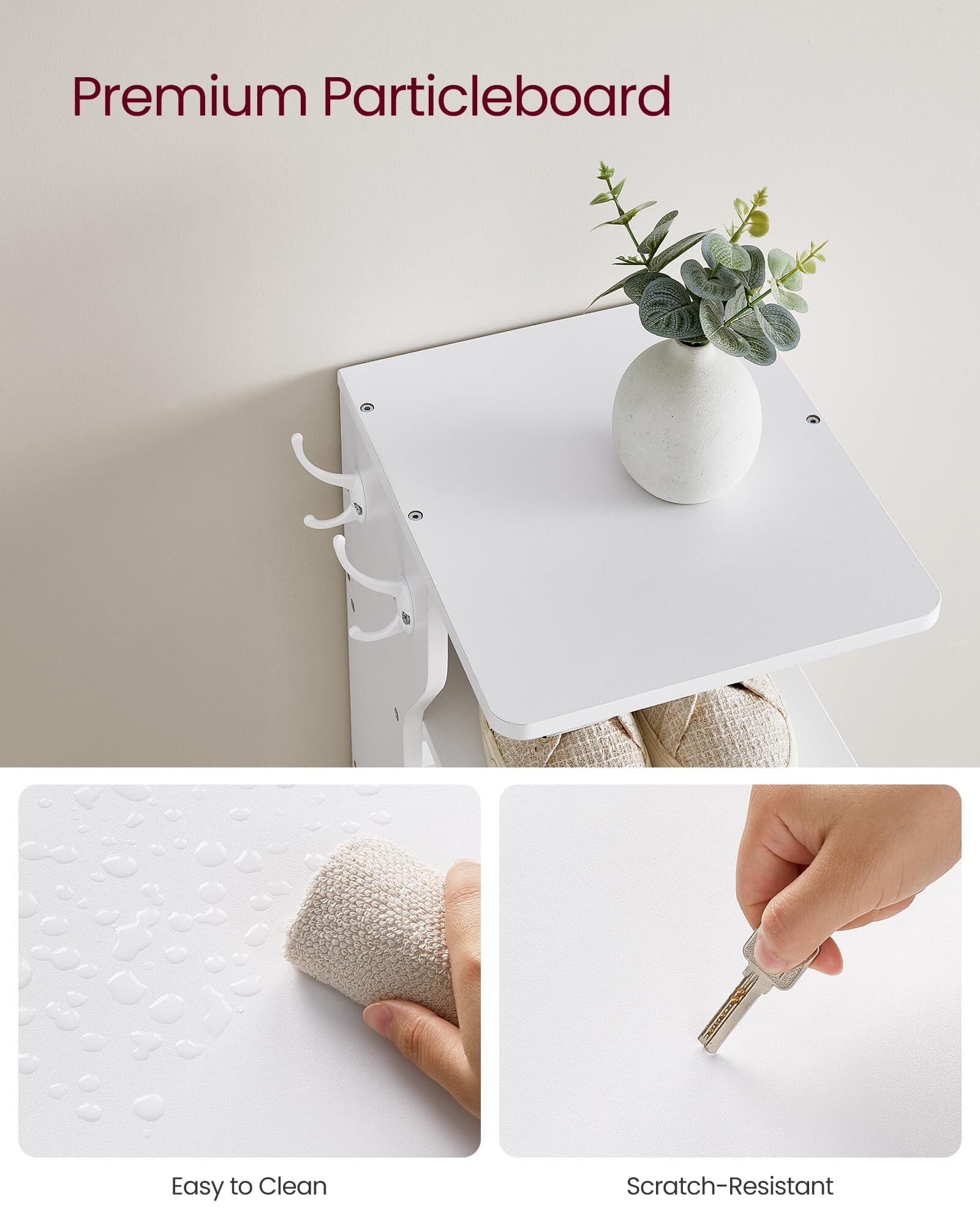 【アクセサリーを掛ける】朝の忙しい時間に、このコーナーシューラックのフックに鍵や財布を掛けてサッと取り出して出かけることができます。さらに、2つのフックは必要に応じて左右どちらにでも取り付けることができます。