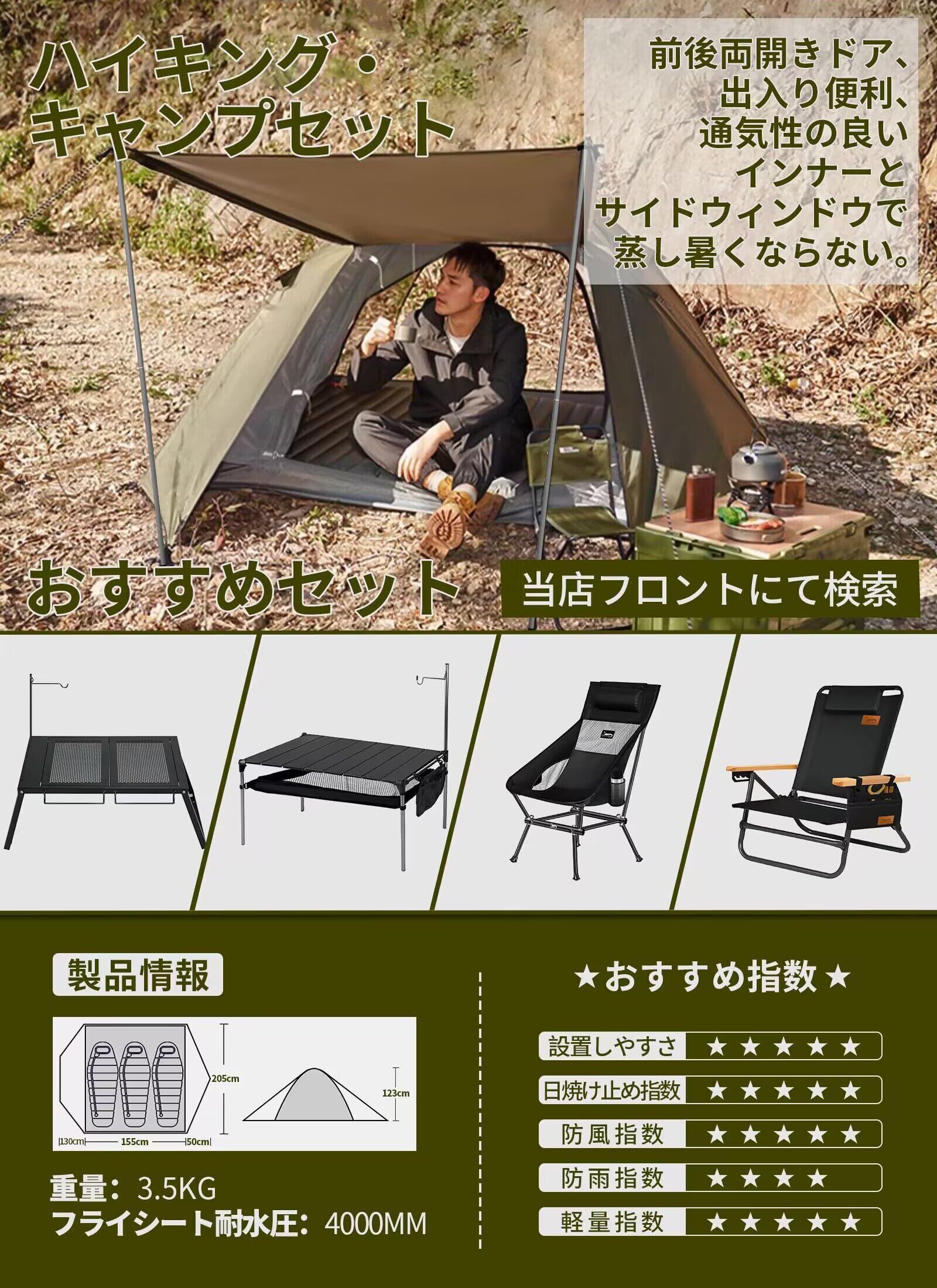 【こだわる機能満載】ダブルファスナー:開閉用のフロントシート、インナーメッシュはダブルファスナーが付いていますので、内外両側から簡単に開け閉めができます。 ランタンフック:寝室部分にランタンフックを配置して、夜間のテントライフをより快適にします。またキャンプやツーリングの細々とした道具・装備を吊るすことも可能です。 【虫の侵入なし】インナーテントのメッシュの網目は、風通しを確保しつつも虫が入ってこられないちょうどよい細かさに設計されています。蚊帳としての役割も十二分に果たします。